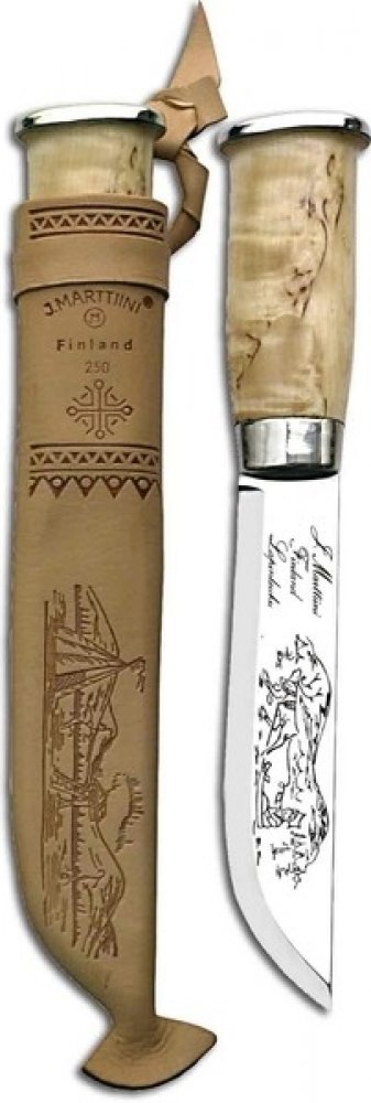 Celková délka: 27 cmDélka čepele: 16 cmDélka rukojeti: 11 cmMateriál čepele: Nerezová chromová ocelMateriál rukojeti: Bříza, lakovanáHmotnost: 185 gPouzdro: Kůže Pevný nůž Lapp Knife 250 od firmy Marttiini je tradiční laponský nůž, který je vhodný pro lov a pobyt v přírodě.Čepel je vyrobena z nerezové oceli a na ní je krásná leptaná rytina s klasickým severským motivem. Rukojeť je vyrobena z kadeřavé břízy s lakovaným povrchem a na konci je rozšířená kovová patka. Součástí nože je kožené pouzdro zdobené Laponskou tématikou. V současnosti při výrobě nožů společnost Marttiini kombinuje nejmodernější výrobní technologie s unikátním finským designem a s tradičními zkušenostmi, které nasbírali za více než 80 let. Velkou pozornost věnují výběru vhodného materiálu pro výrobu čepelí a rukojetí. Vyrobeno ve městě Rovaniemi ve Finsku.