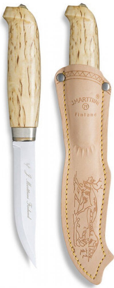 Rukojeť je vyrobena z finské břízy je lakovaná a na konci má rozšířenou patku, která brání vyklouznutí nože z ruky.Součástí nože je krásné světlé kožené pouzdro.