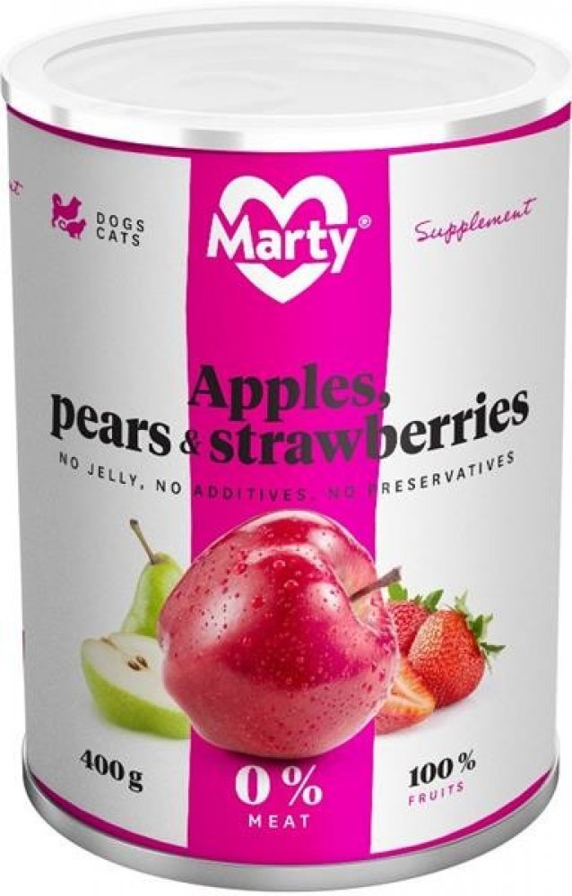 MARTY Supplement - ovocný příkrm je příjemným ovocným spestřením každodenní masité stravy Vašeho domácího mazlíčka. Čerstvá jablka, hrušky a jahody bez konzervantů a aditiv jsou tepelně zpracovány a sterilizovány, takže mají před otevřením mimořádně dlouhou životnost a i po otevření je možné je v zavřené plechovce skladovat v ledničce až 1 týden. Doporučujeme přidávat ke 100% masu řad MARTY Essent...