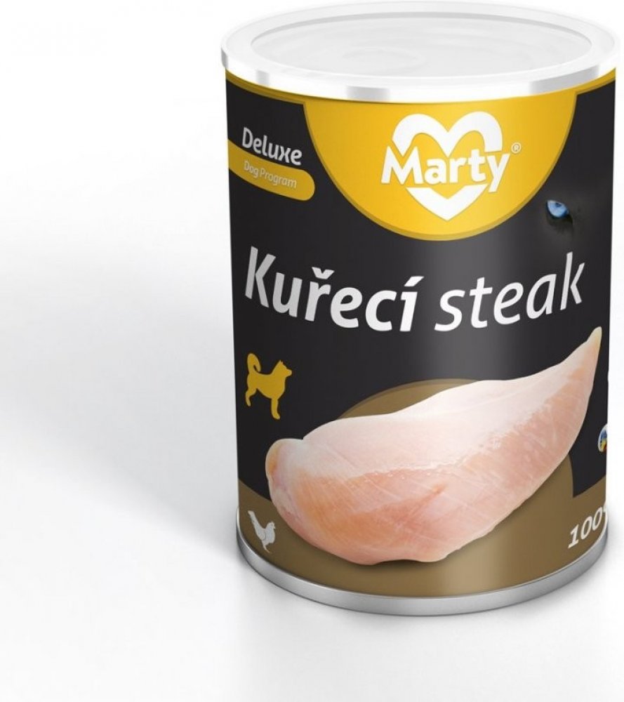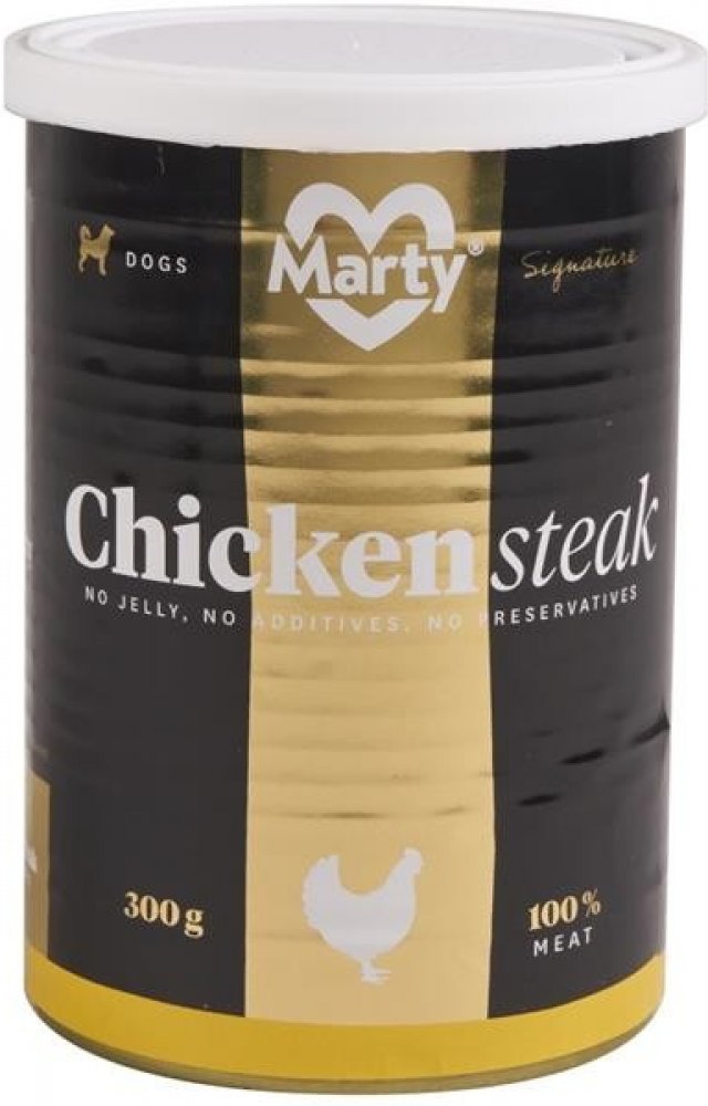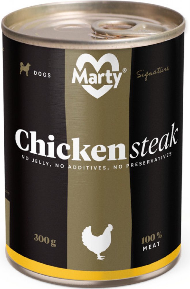 MARTY konzerva pro psy ze 100% masa se vyznačuje stoprocentní živočišnou složkou bez obsahu rýže, sóji, brambor, ale ani přidaných konzervantů. Obsah konzervy je složen ze 100 % z masa obsahující celé kusy nemleté svaloviny nejvyšší kvality nebo například celé kusy kuřat (čtvrtky, křídla, krky,...), hovězí steaky, zvěřinové steaky atd. Konzerva obsahuje kusy masa i s kostmi, tak jak je tomu v případě přirozeného krmení. Není to však na škodu a kosti nemohou poranit trávicí trakt psa, protože jsou vlivem sterilizace za vysokých teplot a tlaku zcela měkké a rozpadají se při prvním slabším zmáčknutí. Naopak jsou tedy velice vhodné pro stravu psa, neboť obsahují vysoké množství kalcia, v kloubech kolagenu a v neposlední řadě také kostní dřeň. To vše navíc pejskovi předkládáte přirozeným způsobem namísto drahých chemicky vyráběných práškovitých doplňků stravy!