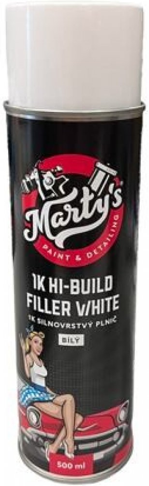 Jednosložkový silnovrstvý brousitelný plnič použitelný také jako základový nátěr s antikorozními vlastnostmi, je vysokosušinový - má velmi vysoký podíl pevných složek, to zaručuje bezkonkurenční kryvost a možnost aplikace v silné vrstvě. Dá se říci, že tímto plničem materiál nestříkáte ale ve skutečnosti souvisle nanášíte na připravený povrch, jeho plnící schopnosti jsou o několik řádů výše než je tomu u běžně dostupných plničů ve spreji v podobné ceně. V nabídce máme Marty´s HI-BUILD plnič ve spreji ČERNÝ , ŠEDÝ a BÍLÝ . Je rychleschnoucí a vhodný na mnoho povrchů Vhodný pro drobné opravy, opravy celých kovových dílů nebo pro části ošetřené polyesterovými tmely . Může být použit na ocel , pozink , hliník , sklolaminát , polyesterové tmely , 2K akrylátové plniče nebo základy, OEM povrchové úpravy , plasty , beton , dřevo , sklo - vždy otestujte přilnavost a v případě potřeby použijte příslušný základ. Reálná zkušenost ukazuje, že je plnič suchý na dotek za méně než 5 minut při 20°C , lze jej brousit a přelakovat zhruba po 1 hodině od aplikace poslední vrstvy! Vždy se však doporučuje počkat o něco déle a držet se doporučení výrobce uvedeného na obalu. Opatřen variabilní tryskou sprej tedy držíte rovně a můžete si zvolit, zda chcete aby stříkal svisle nebo vodorovně . To je velká výhoda při plnění různě orientovaných ploch, sprejovou dózu nemusíte naklápět a nestane se vám, že by vlivem docházejícího plniče ve spreji a jeho vychýlené poloze začal stříkat přerušovaně. Také má trojúhelníkový charakter rozstřiku , což zaručí pokrytí maximálně velké plochy. Čím je tento plnič výjimečný? Spolehlivě ochrání proti korozi díky obsahu antikorozních činitelů a velmi snadno se brousí za sucha i pod vodou. Jeho rychlé schnutí umožňuje jeho použití také při nižší teplotě a umožňuje tak efektivnější práci, spolehlivě izoluje lakované části a může být přelakován jakýmkoliv rozpouštědlovým nátěrem, nebo nátěrem na bázi H2O .