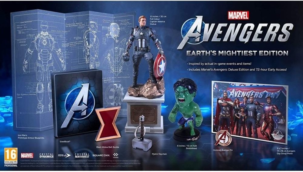 Earth's Mightiest Edition navíc obsahuje: -30cm velkou figurku Cpt. America -Steelbook -Black Widow přeska z pásku -15cm figurka Hulka -Připínáček Avenger -Přívěšek na klíče Thorovo kladiva Mjolnir -13x18cm pohlednice s Avengery -Iron Manovo plánek obleku