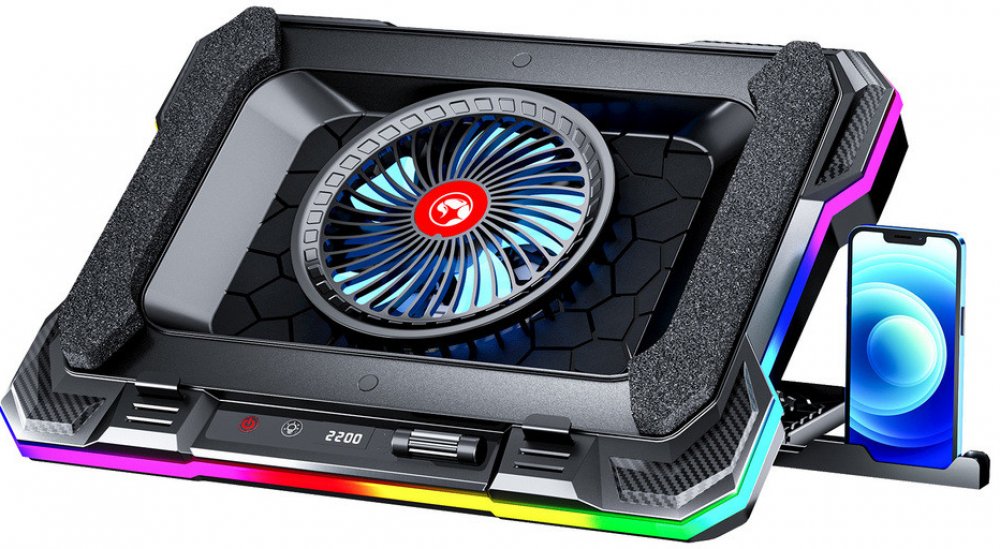 stojan pod notebook;pro vel.14-19";s větrákem;vstup.napětí:5V;proud?1.5A;výkon:5W;otáčky:300-2200RPM;průtok vzduchu:89CFM;hlučnost:28-52±3dBA;životnost:30000h;2USB porty;7nastavitelných úhlů mezi 20-45°;napájení z USB;podsvícení RGB-lze ovládat pomocí LCD displeje;materiál:plast+kov;držák na telefon