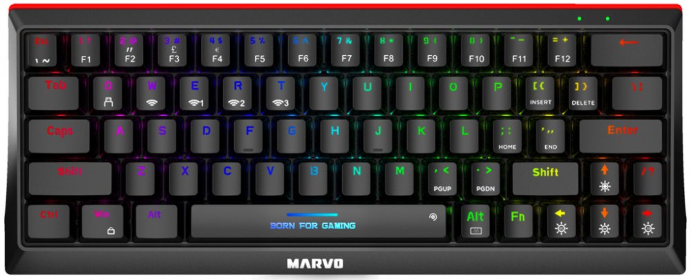 Marvo Hecate 61WR není jen funkční, ale i stylová. Nabízí několik režimů rainbow podsvícení, které si můžete přizpůsobit podle své nálady nebo herního prostředí. Snadno lze nastavit různé efekty, jako je pulzování, vlnění nebo statické podsvícení, a přizpůsobit si tak atmosféru každé hry. Nechybí ani možnost regulace jasu, takže si můžete světelné efekty upravit podle svých preferencí. S touto klávesnicí bude váš herní setup vypadat skvěle i ve tmě.