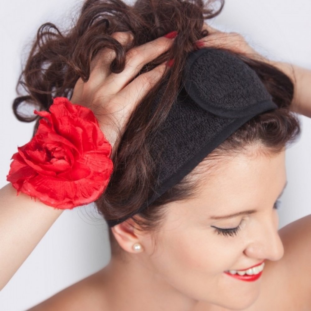 Kosmetická čelenka z velice hebkého materiálu froté a s univerzálním zapínáním na suchý zip. V černém provedení. Čelenka je vhodná nejen do sauny, ale během SPA procedur doma nebo v salónu. Čelenka pohodlně přidrží vlasy a dodá vám úžasný relaxační pocit, jako byste se zrovna hýčkala v profesionálním salónu krásy.