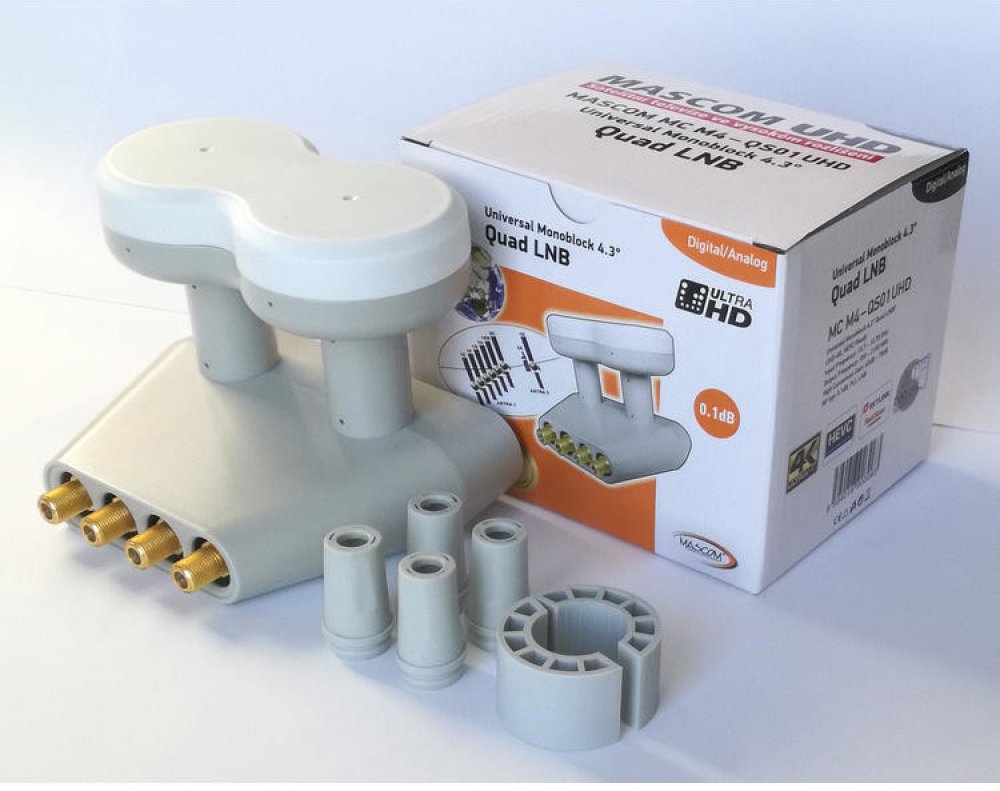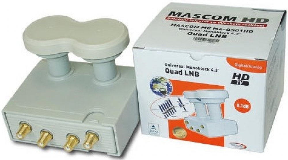 Univerzální monoblok quad 4,3°, který je přesně optimalizován pro příjem družice Astra3 (23,5°) a Astra1 (19,2°) při příjmu z paraboly s rozměrem 80cm.