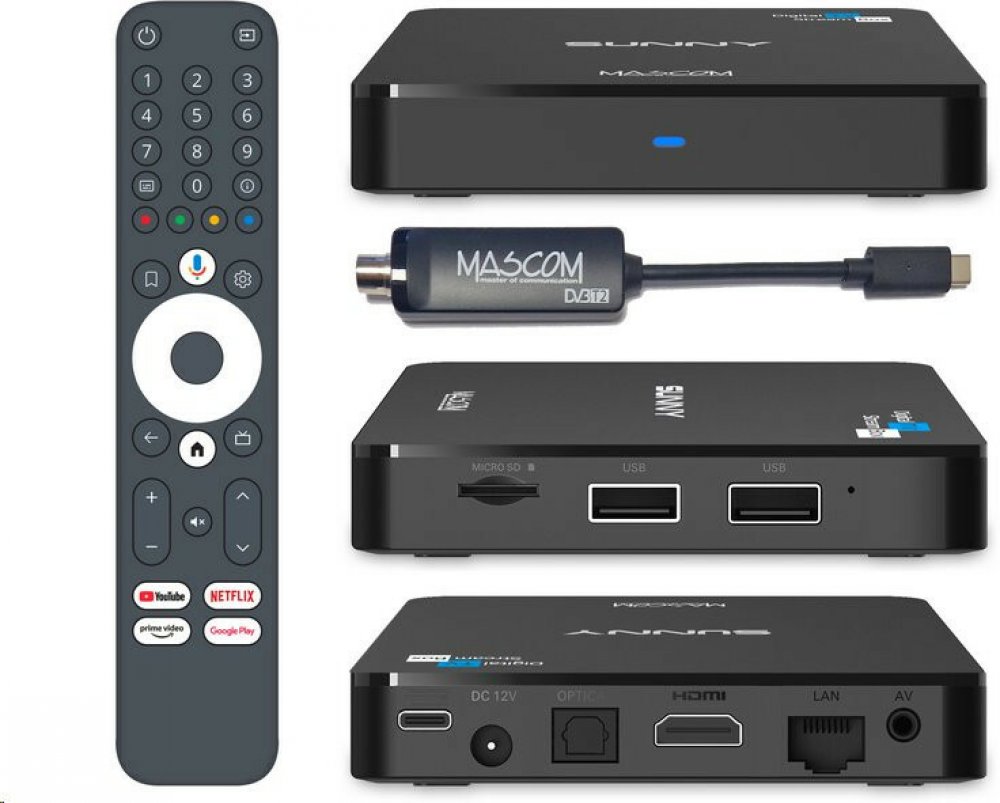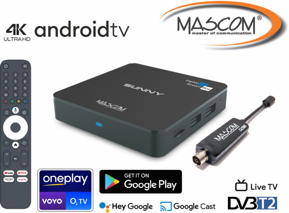 4K ANDROID TV settop box s DVB‐T2 tunerem (s připojeným DVB‐T2 tunerem – součást dodávky).