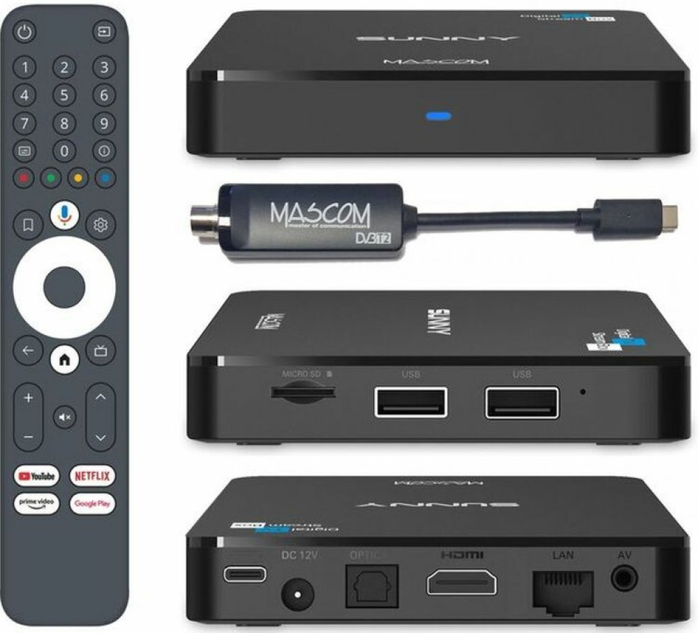 Android box, DVB‐T2 TUNER, dálkový ovladač, HDMI kabel, návod, napájecí adaptér