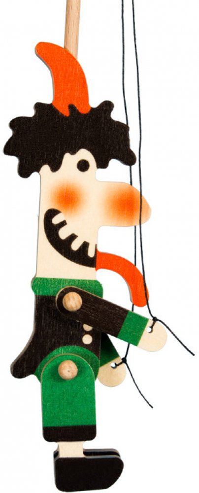Budliky, budliky. Jsem čert. Jsem loutka z pekla. Loutka, co představuje zákeřníka, co se snaží někomu překazit cestu za štěstím. Nebo můžu být ten hodný čertík Bertík, co by ani mouše neublížil. Jakou variantu pohádku si zahrajeme?Jsem dřevěná loutka v nápaditém podání. Jsem konstruován velmi jednoduše – štíhlé tělo, tyč na držení a ovládání, ruce na dvou provázkách a pohyblivé nožičky. Díky lehkému ovládání se mnou dokážou hrát nejkrásnější pohádky i ty nejmenší děti. cca 15 cm cm Dřevo Shora pomocí vodící tyče se dvěma provázky Divadlo pro loutky s nápadem, loutky s nápadem, doplňky a scénáře Emil Hauptmann Mašek