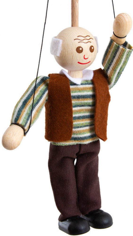 Jsem DĚDEČEK - loutka na tyči s dvěmi vodícími nitěmi. Hodím se pro menší i větší děti, procvičíte se mnou Vaše prstíky a dejte své fantazii co proto při vymýšlení Vašich zábavných příběhů.