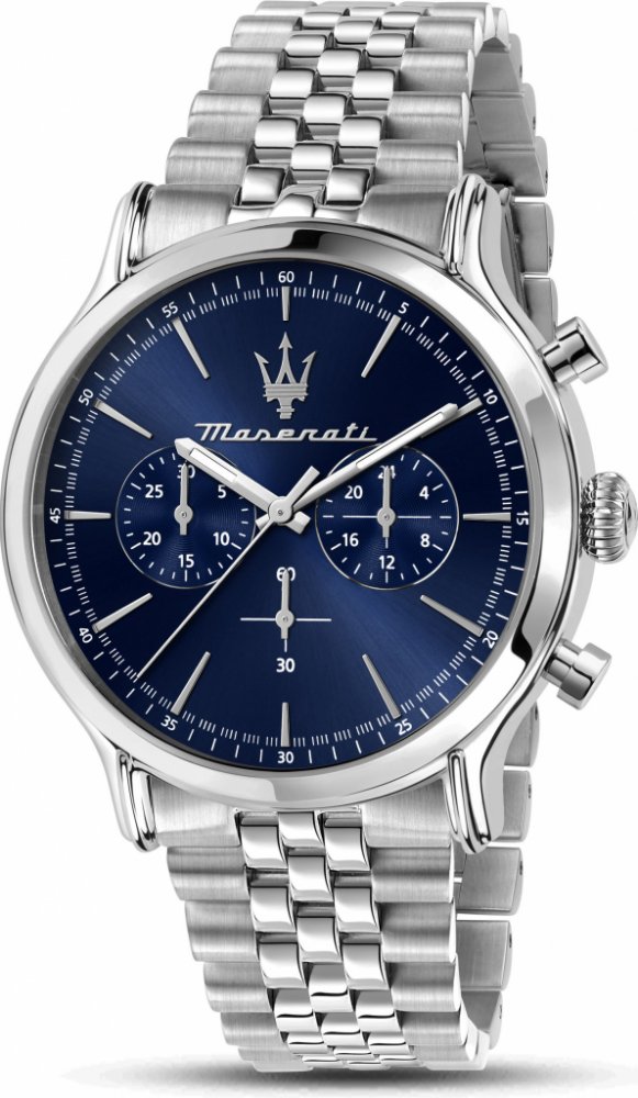 klasicky elegantní pánské náramkové hodinky, přesný quartzový strojek, funkce stopek až na 30 minut po vteřinách, druhé časové pásmo, tmavě modrý sluneční ciferník s šedým potiskem, stříbrné ručičky a indexy, luminiscenční hodinové a minutové ručičky, centrální vteřinová ručička, leštěné pouzdro z nerezové oceli, šroubovací zadní strana pouzdra, šroubovací korunka se značkou loga, minerální sklo odolné proti poškrábání, náramek z nerezové oceli matný/leštěný, bezpečnostní skládací spona s vyrytým logem, vodotěsnost do 10 barů, průměr pouzdra 42 mm, výška 11,5 mm Značka: Maserati - Číslo výrobce: R8873618024 - Série výrobce: Epoca Chrono 42mm - Funkce: 24 hodin, Chronograf, Minuty, Sekundy, Hodiny - Pohon: Baterie (Quartz) - Barva ciferníku: Modrá - Displej: Tvar pouzdra: Stříbrný - Materiál pouzdra: Nerezová ocel - Tloušťka pouzdra: 12 mm - Tvar pouzdra: Dlouhý - Barva pouzdra: Stříbrná: Materiál náramku: Nerezová ocel - Barva náramku: Stříbrná - Šířka ucha náramku: 21 mm - Zapínání: Skládací zapínání - Max. obvod zápěstí: 210 mm - Velikost náramku: 210 mm. Obvod zápěstí: 210 mm - EAN: 80332883811 - Hmotnost položky: 0,12 kg - Součástí dodávky je: návod, krabička, záruční list, vnější krabička