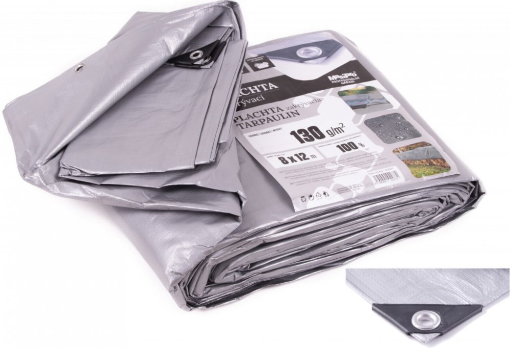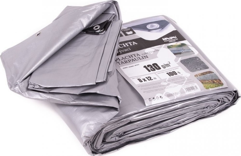 Krycí nepromokavá plachta 8x12m z polyethylenových vláken o hustotě 130g/m2, je odolná vůči povětrnostním podmínkám a protržení. Plachta je s kovovými oky kolem celého obvodu po 100cm. Rohy plachet jsou chráněny plastovým krytem proti protržení. Profi zakrývací plachta je vhodná na stavbu, pokrytí střechy, automobilu, dřeva, apod.
