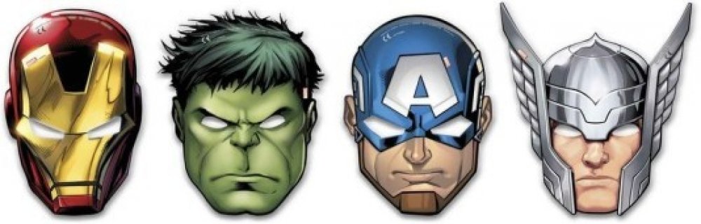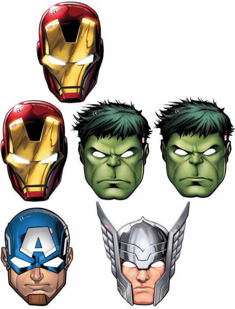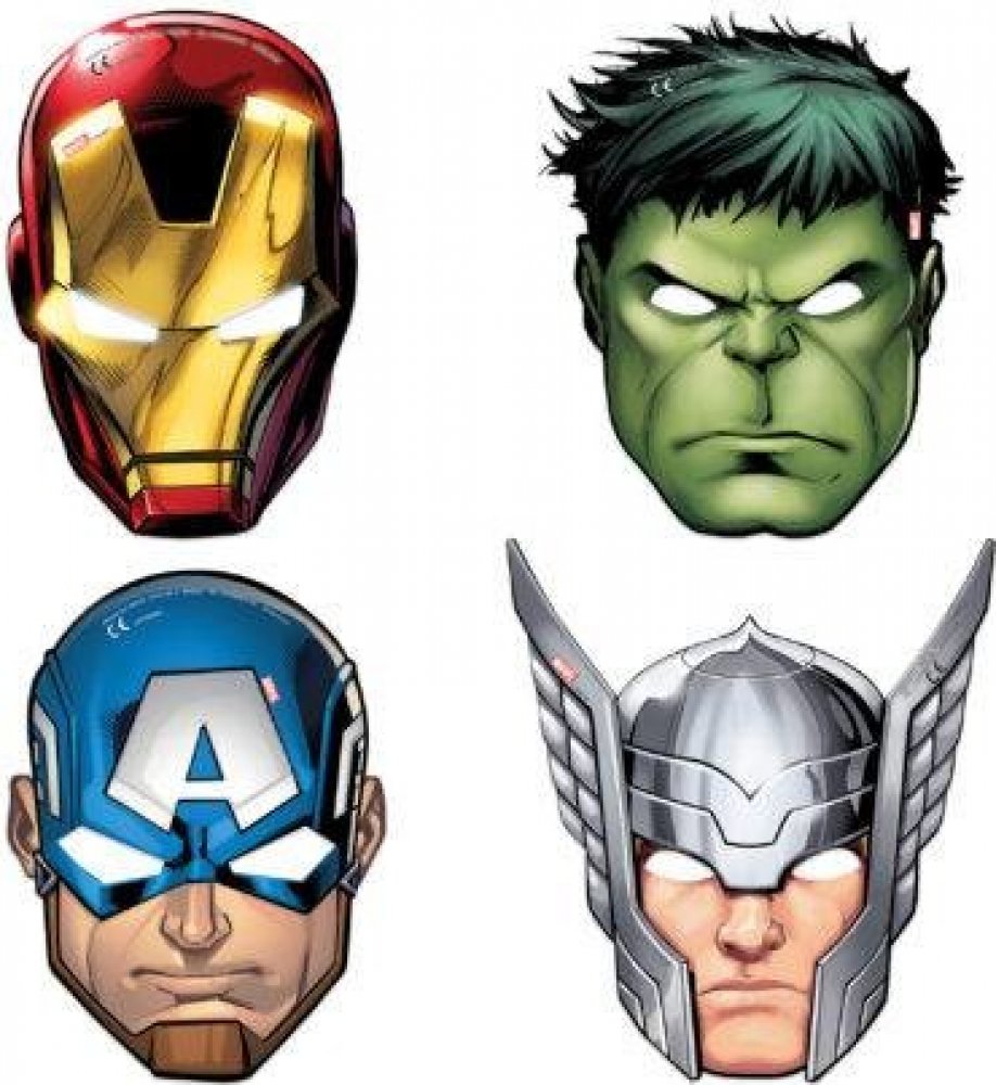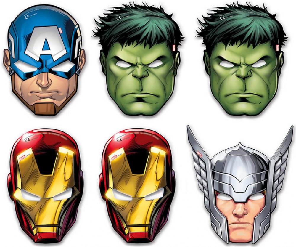 Papírové masky kultovních postav z Avengers, na gumičku. Vhodné jako doplněk na tématickou párty či karneval. Balení obsahuje celkem 6ks masek. Každé balení obsahuje 4 různé varianty masky.