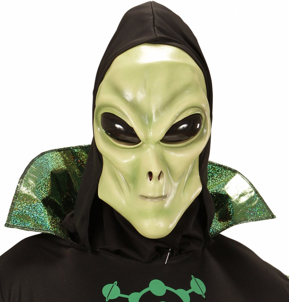 Zelená obličejová maska mimozemšťana s černým přehozem přes hlavu.