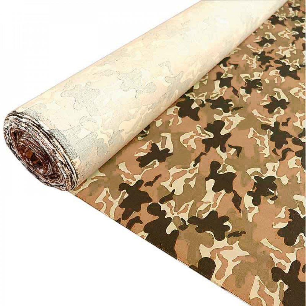 specifikace: kvalitní pevná bavlněná látka s krémovou, bledě-hnědou, okrovou a černým potiskem, odolná vůči oděru a roztržení, vhodná na zhotovení vlastních kamuflážních oděvů, batohů, tašek, klobouků, obalů na sportovní potřeby, ochranných návleků, přístřešků apod., materiál není hydrofobní, či...