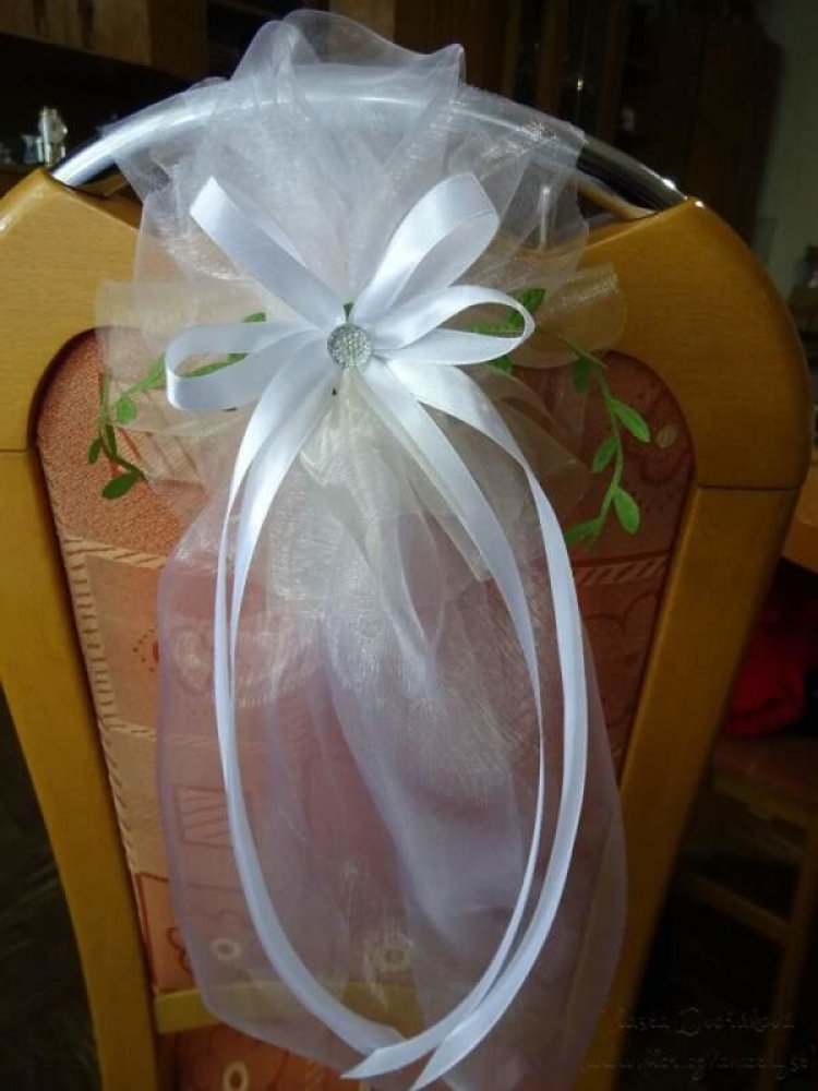 Mašle, které nádherně dozdobí židle u svatební tabule, jsou vyrobeny z organzového pásu, mašle se zelenými lístky z bílé a smetanové organzy a atlasové mašličky s kamínkem.