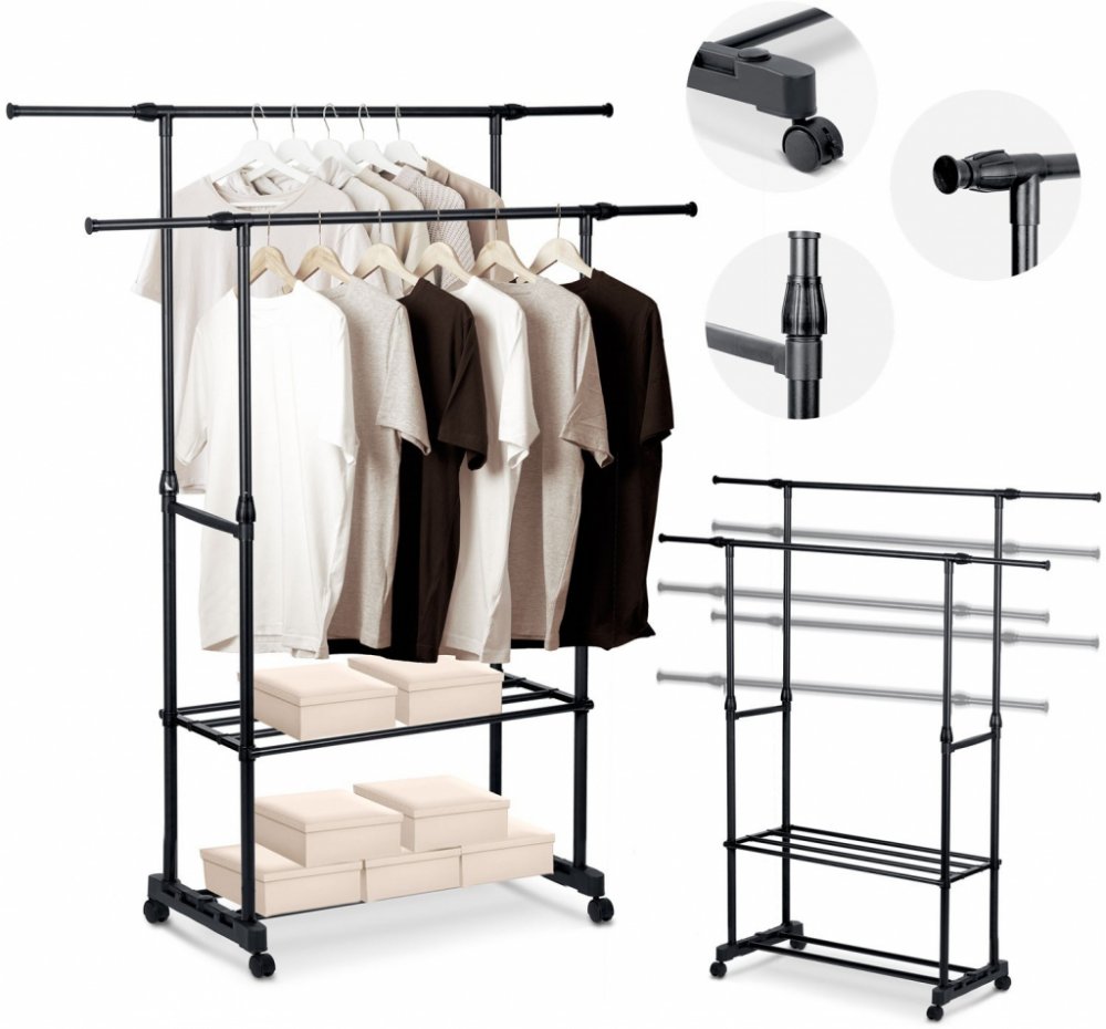 Prezentovaný věšák má dva držáky , například na kravaty a podobně. Je praktický pro studenty, při renovaci dobře poslouží v domácí šatně, ale i na kabáty pro hosty. Ideální pro rodinu s dětmi díky nastavitelné ergonomické výšce.