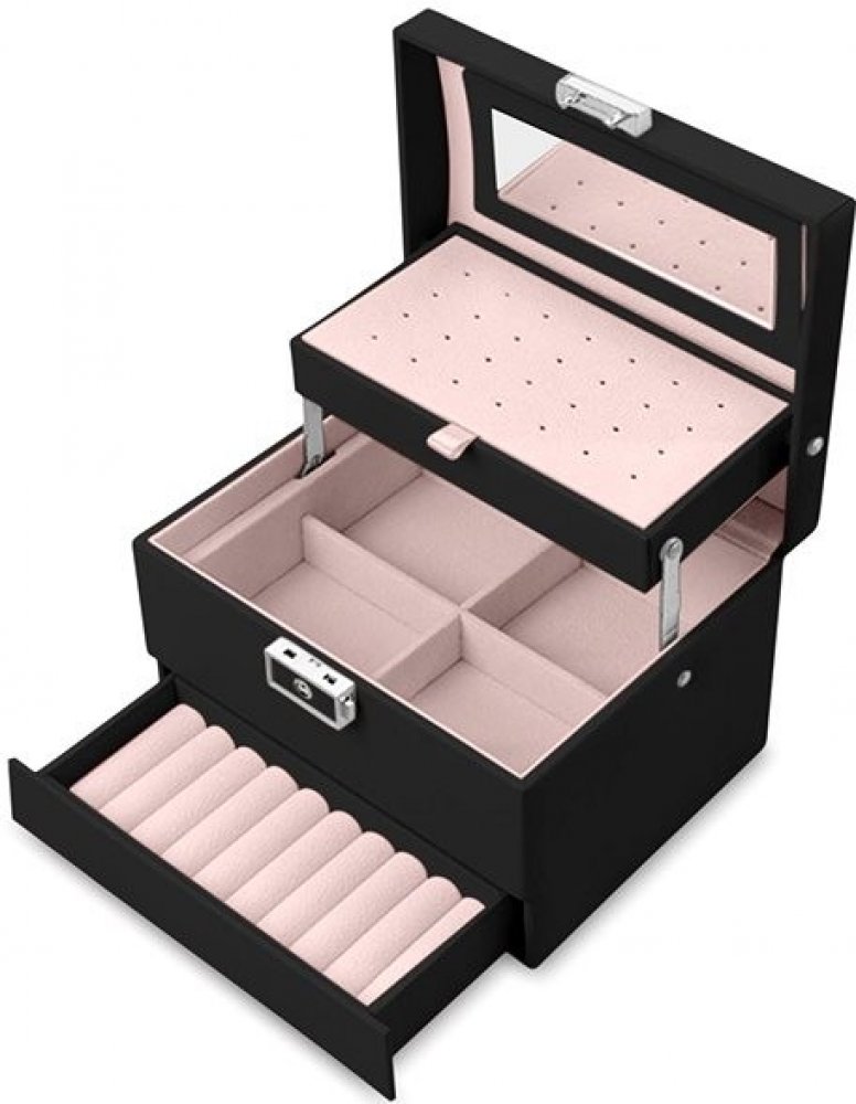 Šperkovnice Massido je navržena tak, aby uchovala vaše cennosti v bezpečí. Díky syntetické kůži je nejen stylová, ale i snadno udržovatelná. Možnost uzamknutí zajistí, že obsah zůstane v bezpečí a chráněn před neoprávněnými osobami. Příjemným bonusem je zrcátko, ve kterém si můžete kdykoliv zkontrolovat svou vizáž. Uvnitř najdete 2 patra, tudíž budete mít kam schovat všechny prstýnky, náramky i ná...