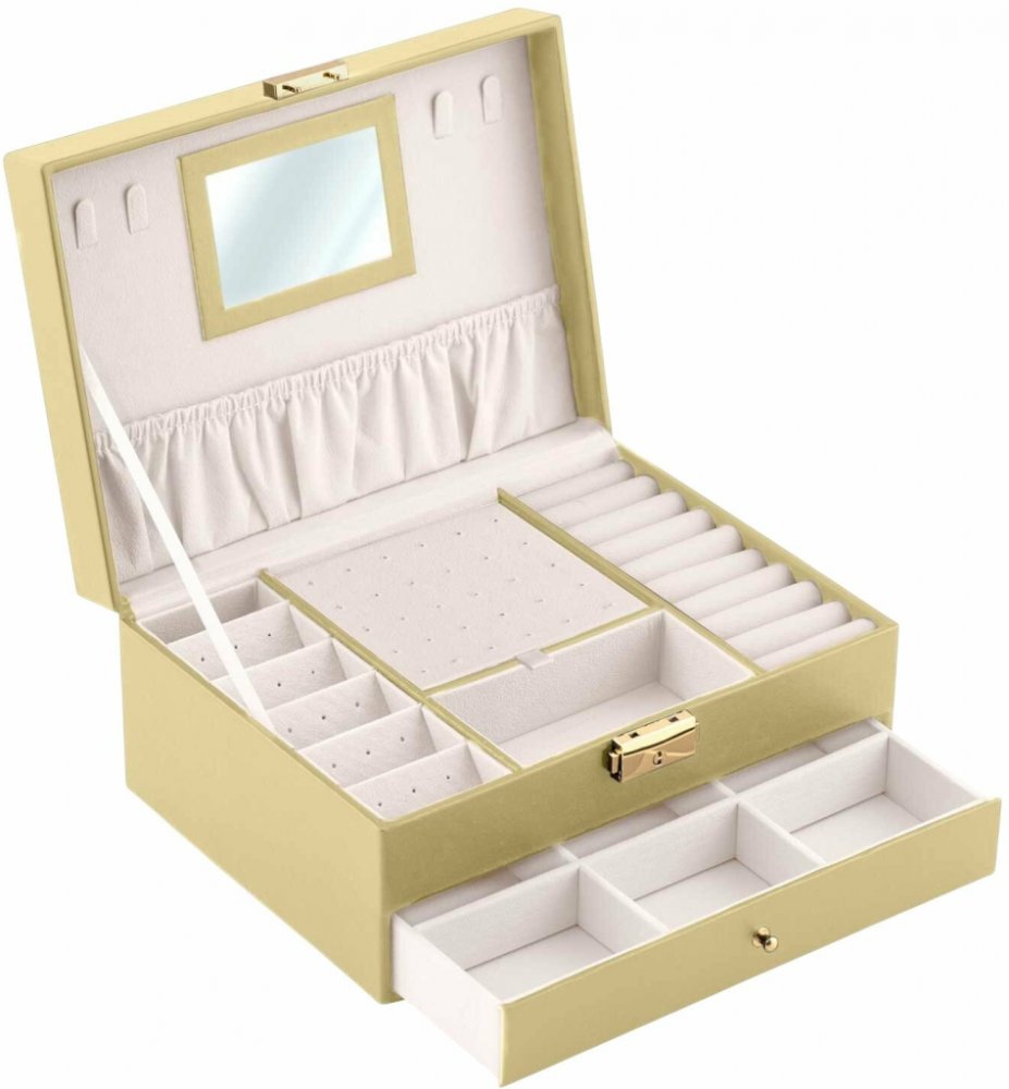 Šperkovnice Massido nabízí bezpečné místo pro vaše klenoty. Je zhotovena ze syntetické kůže, což jí propůjčuje eleganci a zajišťuje jednoduchou údržbu. Uzamknutí zajišťuje, že obsah bude chráněn před neoprávněným přístupem. Díky zrcátku ihned uvidíte, jaký šperk se nejlépe hodí k vašemu outfitu. Klíčové přednosti šperkovnice Massido Šperkovnice MS - 709 zlatá Šperkovnice Massido je perfektním řeše...