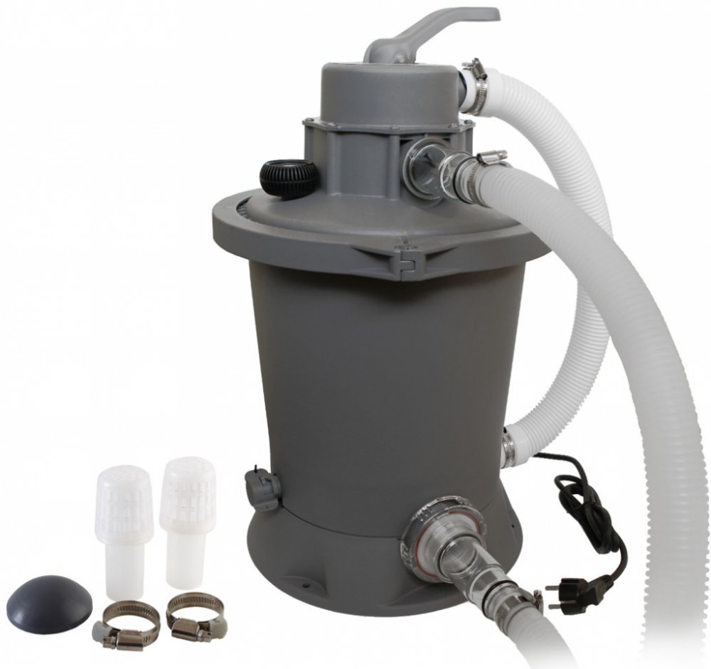 Bazénová písková filtrace pro nadzemní bazény s průtokem 3.028 litrů za hodinu. Doporučeno pro nadzemní bazény s objemem až 24.000 litrů.