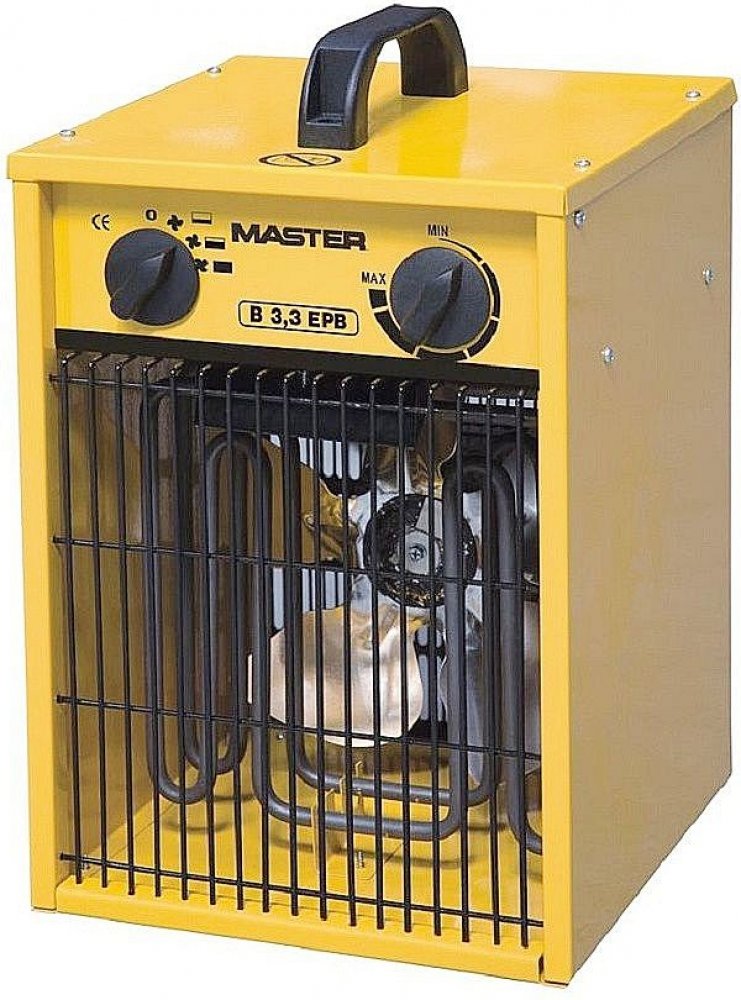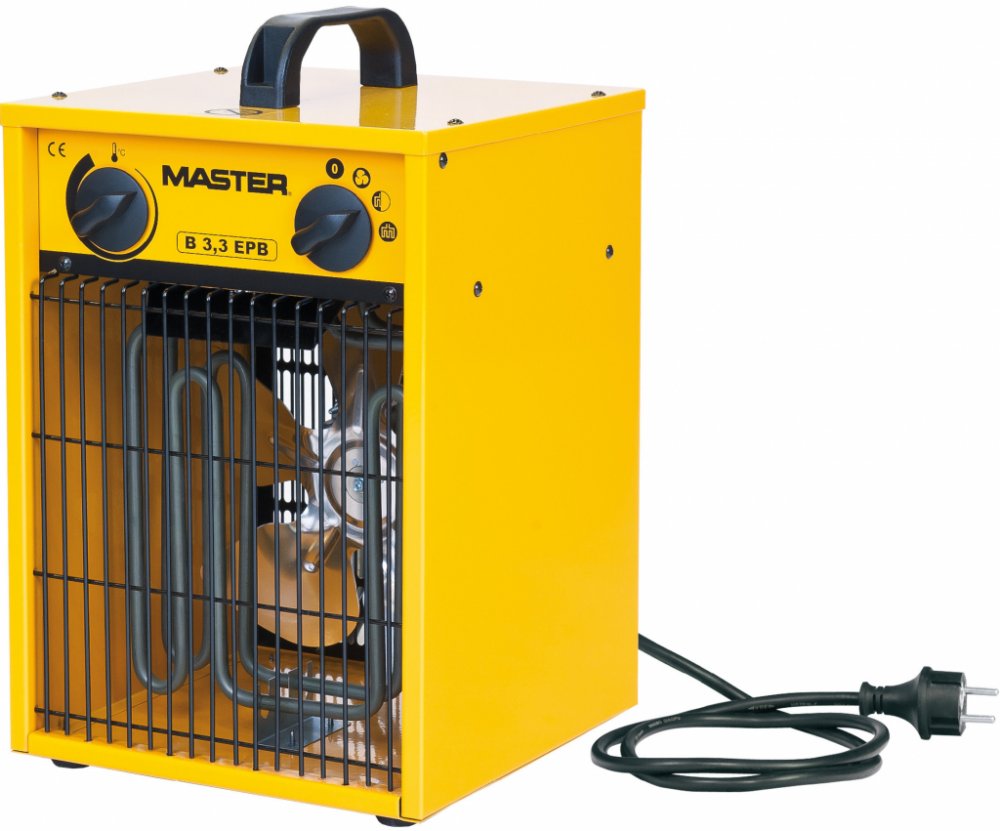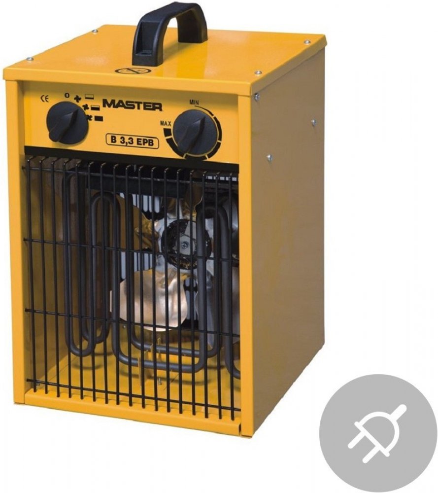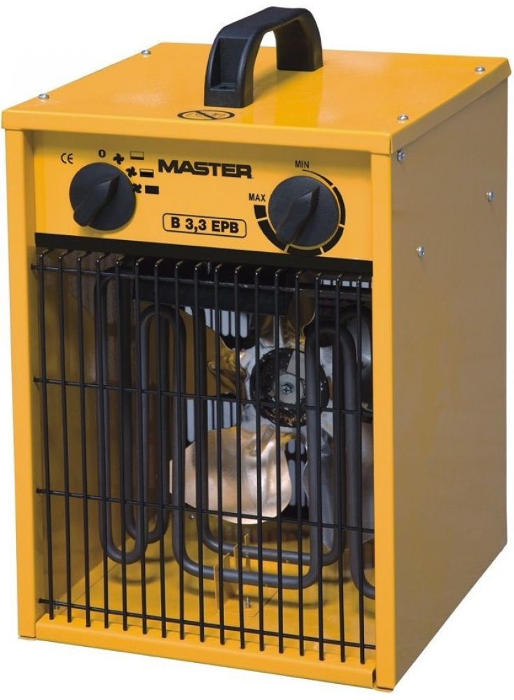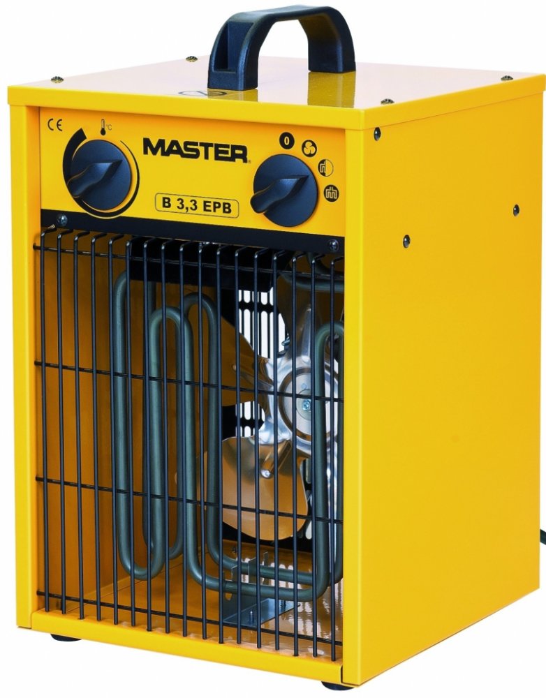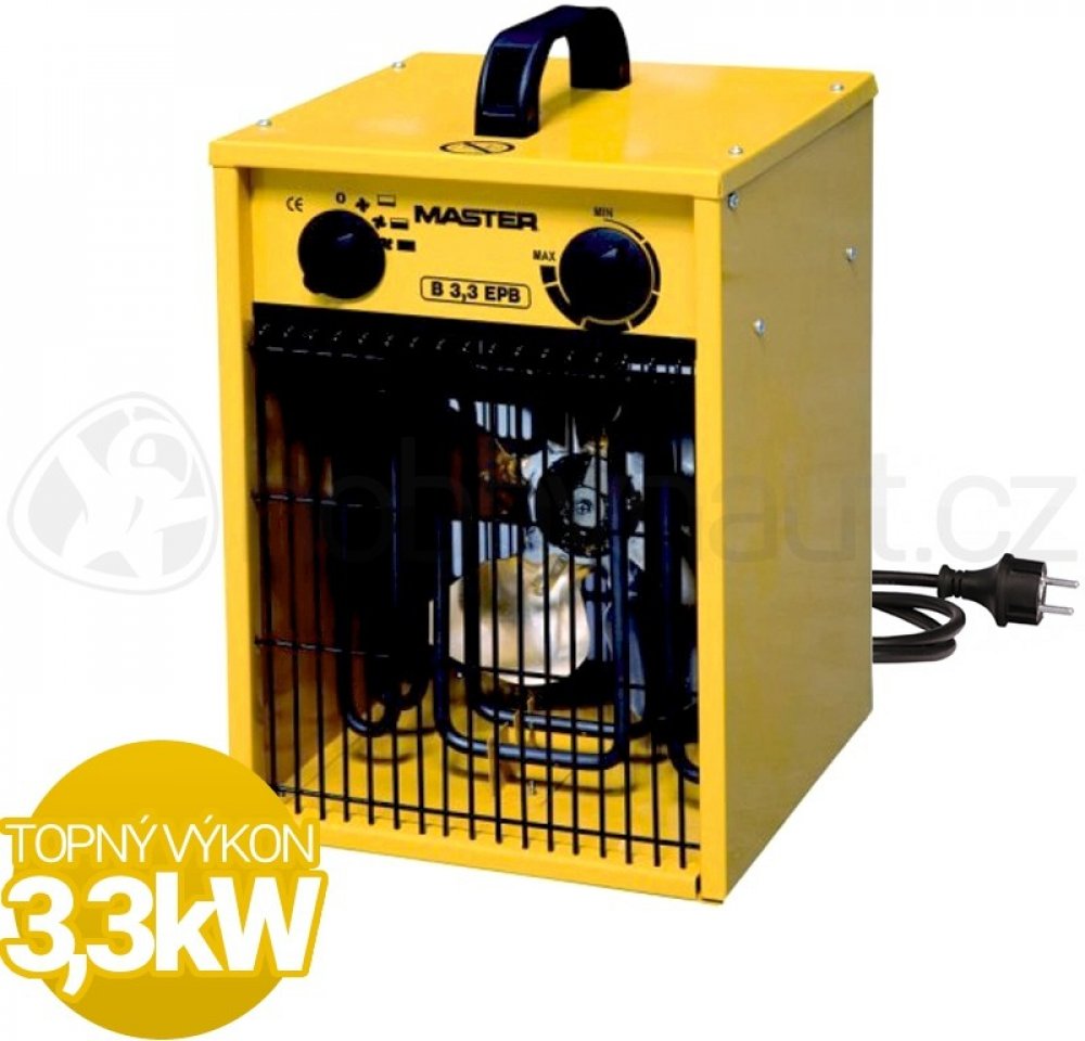 Elektrický přímotop Master B3,3 EPB je jedno z nejprodávanějších elektrických topidel vůbec. Master B3,3 EPB o výkonu 3,3 kW je nejsilnější elektrický ohřívač s připojením na běžnou zásuvku 230 V. Konstrukce topidla má díky robustnosti velmi dlouhou životnost. Topné prvky ohřívače jsou z nerezové oceli, motor je vybaven tepelnou ochranou a termostatem proti přehřátí.
