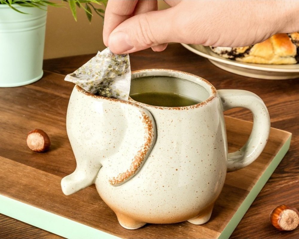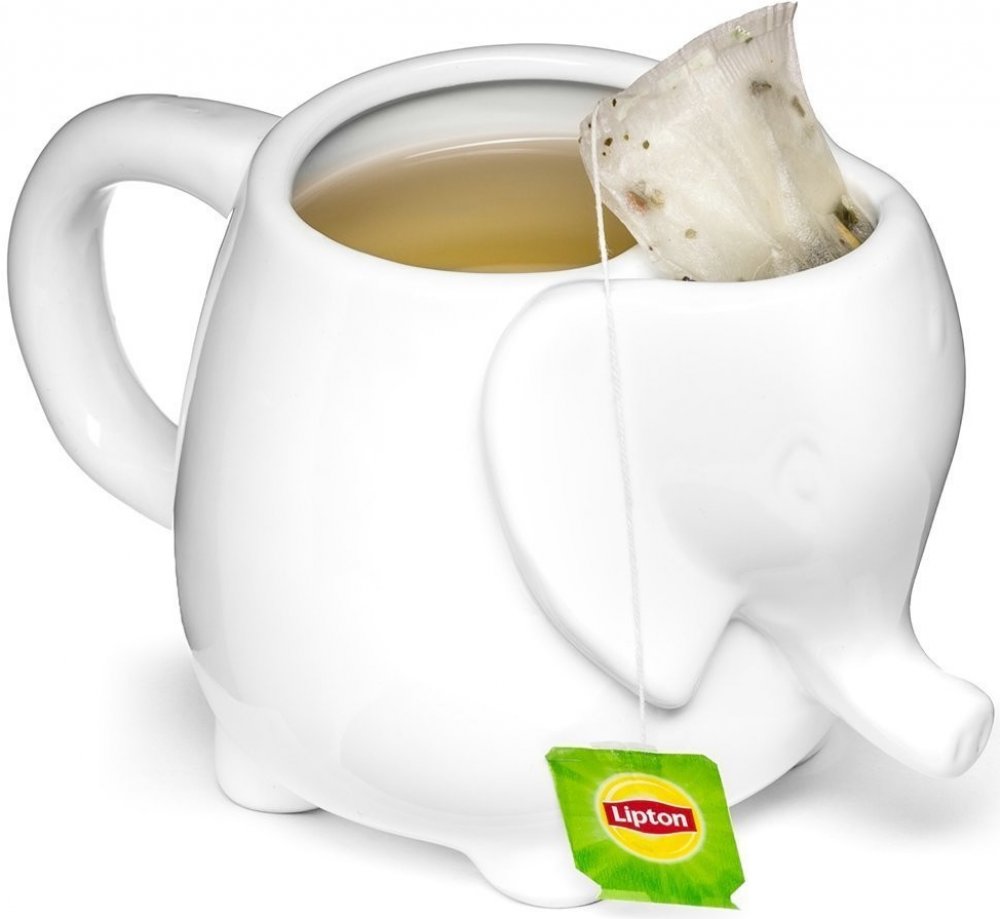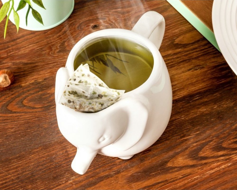 Krásný hrnek ve tvaru slona vyrobený z žáruvzdorného porcelánu s praktickou kapsou na čajový sáček v hlavě slona.