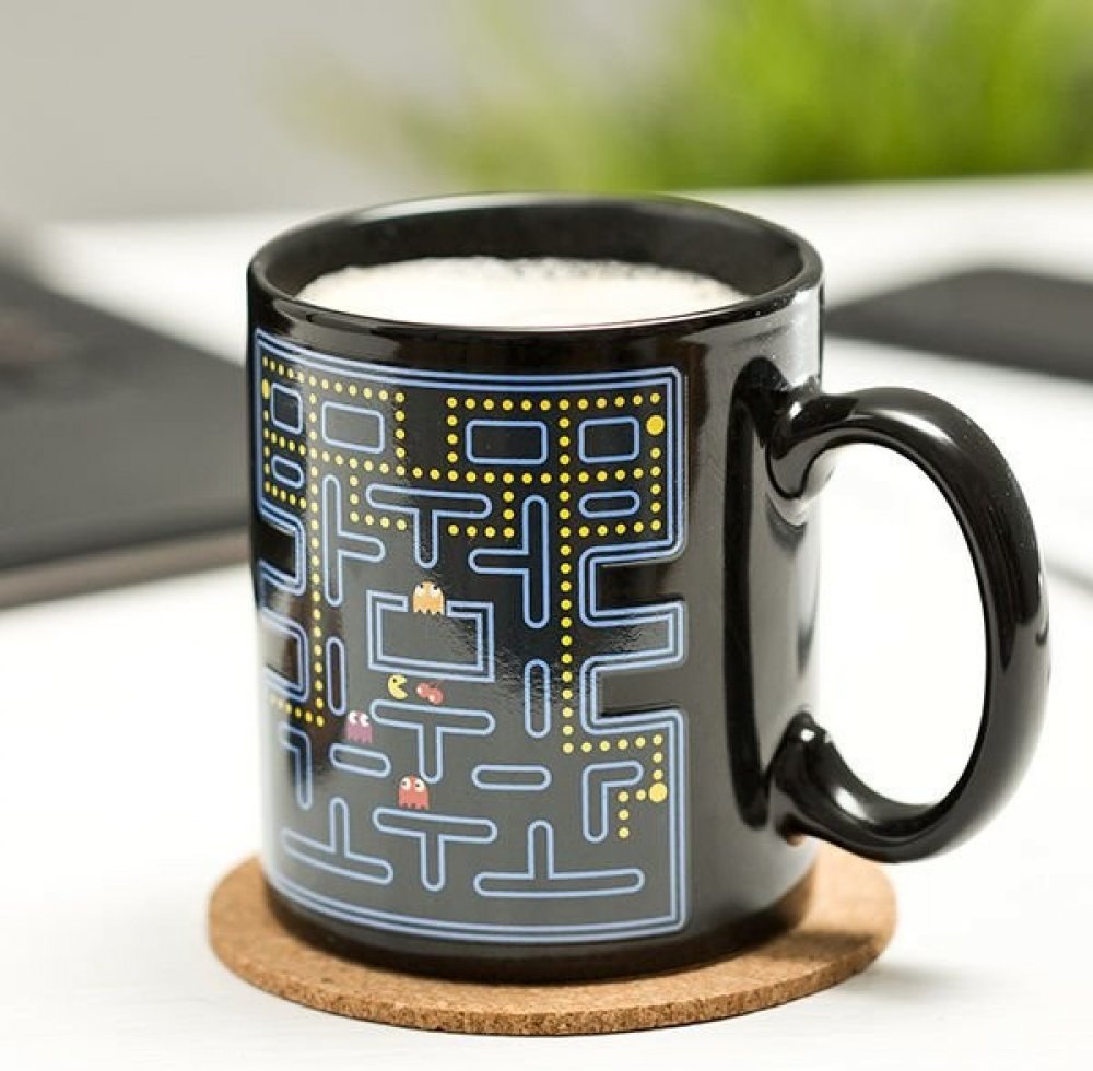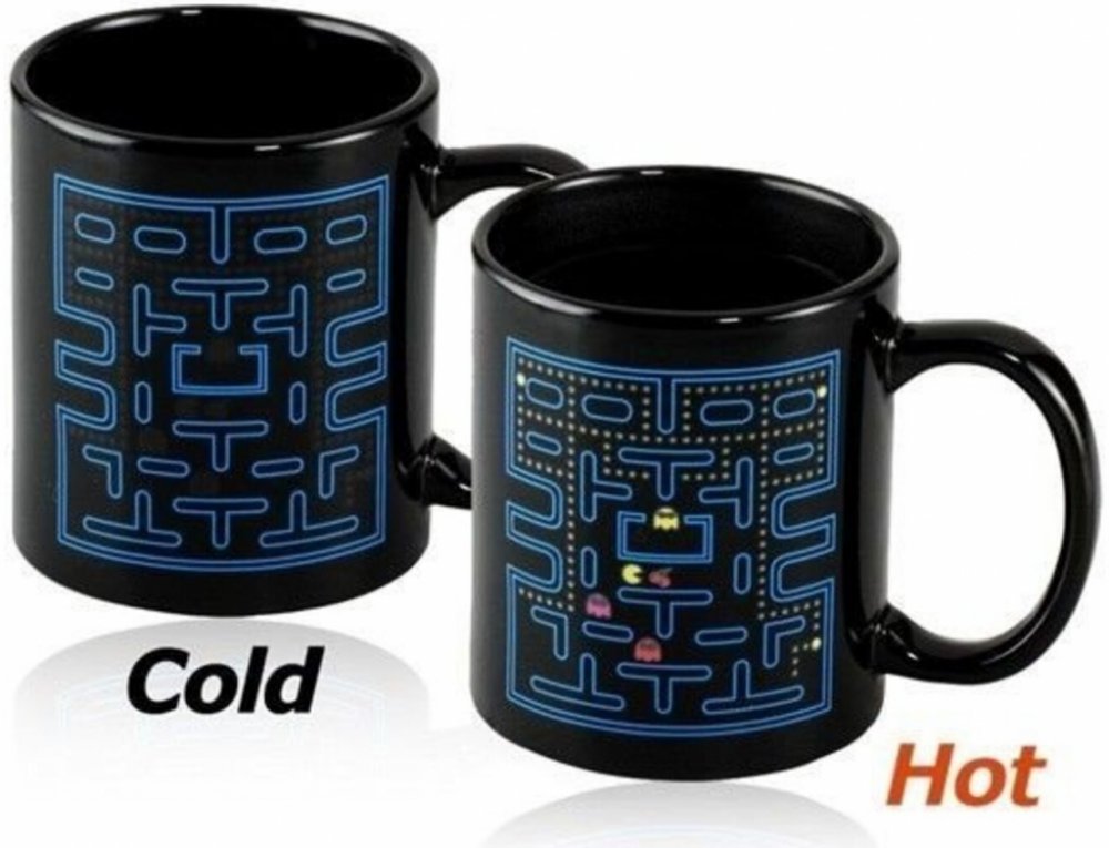 Magický měnící se hrnek s motivem oblíbené hry Pac-Man. Hrníček je na první pohled černý s obyčejným bludištěm. Po nalití horkého nápoje však změní barvu/obrázek a vyobrazí se něm jednotlivé příšerky ze hry Pac-Man.