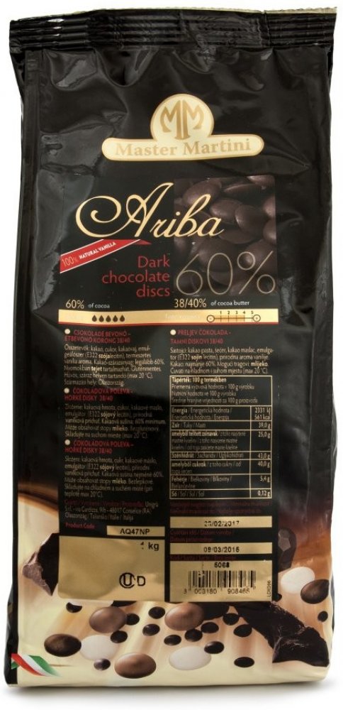 - Složení: Kakaová hmota, cukr, kakaové máslo, emulgátor (E322 slunečnicový lecitin), přírodní vanilkové aroma.