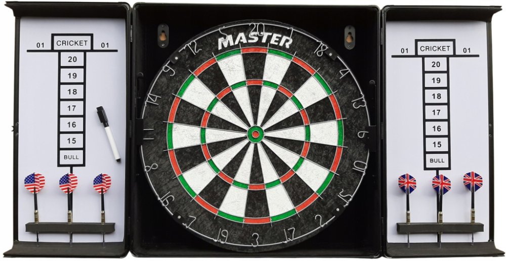 Hliníková skříňka se štítem MASTER a Šipky - je sada, která obsahuje hliníkovou skříňku s výsledkovou tabulí (uvnitř dveří), kvalitní sisalový terč o průměru 45 cm, 2 sady mosazných šipek (tj. 6 ks ) a fix pro zaznamenávání výsledků. Sisalová dlažba je vyrobena ze štětin rostliny agáve sisalové, rostliny rostoucí v Brazílii, ze které se vyrábějí lana a šňůry. Dlouhá, tenká vlákna této rostliny jsou srolována, položena do oválného tvaru a lisována. Poté jsou broušeny a barveny. Tyto kotouče jsou kvalitní a především odolné.