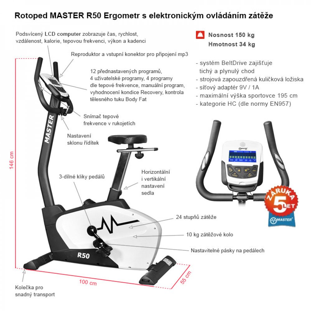 Rotoped MASTER R50 Ergometr s maximální výbavou pro náročné uživatele. Velký computer poskytuje kompletní přehled o Vašem tréninku a spoustu nadstandardních funkcí. Rychloupínací šrouby umožňují rychlé nastavení pro více uživatelů. Těžší zátěžové kolo ergometru zaručuje plynulý chod a možnost nastavení vyšší zátěže pro opravdové sportovce.
