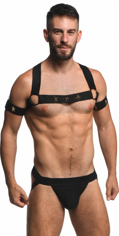 Šmrnc a pohodlí zároveň? Ano, v tomto sexy strečovém postroji je všechno možné! Ozdobí váš hrudník a paže a kovové hvězdičky z vás udělají hvězdu večera. Hodí se na holou kůži i ke všem typům oblečení. Pružný materiál je měkký a příjemný pokožce a lze jej snadno prát v pračce.