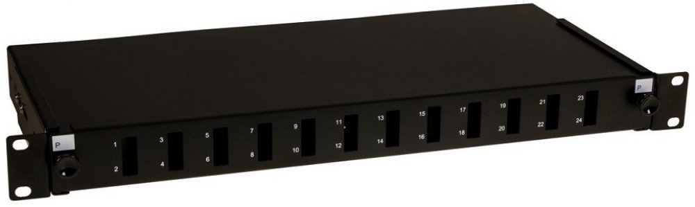 Optická výsuvná vana výšky 1U do 19" racku v černé barvě pro 12 SC duplex nebo 12 LC quad konektorů. Optická vana umožňuje na zadní straně namontování až 4 průchodek