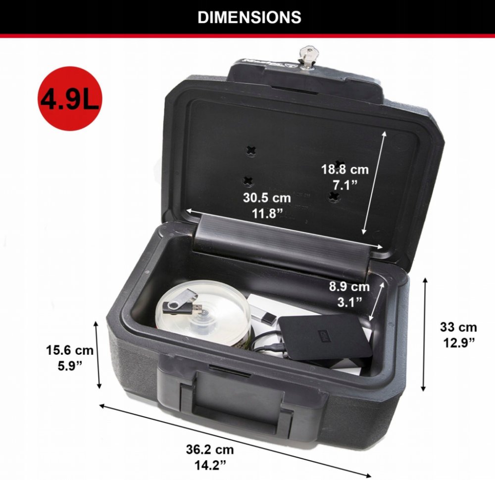 Uzamykatelný bezpečnostní kufr H0100EURHRO na cennosti je vhodný pro uchování digitálních médií a písemností ve formátu A4, jako např. dokladů či fotografií, drobné elektroniky. Box má pevnou ocelovou konstrukci, která je certifikovaně odolná vůči ohni (do 30 min) a vodě (až 72 hodin). Kufr má i praktické držadlo. Součástí balení jsou 2ks klíčů.