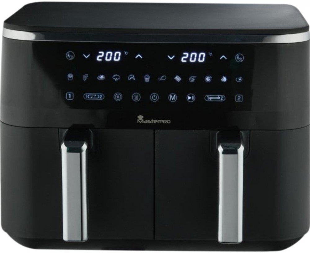 Masterpro® Dvouzónová horkovzdušná fritéza Bgmp-9542, 9 l Vlastnosti Objem: cca 9 l 2x 4,5 l Příkon: 220–240 V, 50–60 Hz, 2600–3100 W Technologie 360° Rapid Air Heating Circulation Individuálně nastavitelná teplota / čas: 80–200 °C / 1–60 minut Regulátor teploty s LED displejem a dotykovou obrazovkou 12 přednastavených programů: hranolky, ryby, steak, zelenina, kuřecí křídla; koláče; kuřecí stehna...