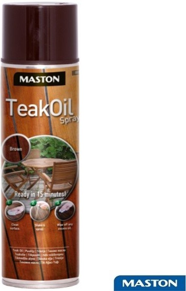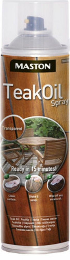 Maston TEAK OIL SPRAY je snadno použitelný ochranný a ošetřující prostředek na ošetření jakéhokoliv druhu dřeva. Tradiční a staromódní vzorec varu lněného oleje na dlouhou dobu dává produktu Teak Oil spray jedinečnou schopnost proniknout hluboko do dřeva a vytvářet ochrannou vrstvu bez filmování na povrchu. Teakový olej posiluje dřevěný povrch a obnovuje jeho přírodní tón. Zabezpečuje odolnost vůči měnícím se klimatickým podmínkám a chrání efektivně proti vlhkosti, suchu, ohybu a třepení. Krátká doba schnutí dělá produkt ideálním na ochranu vnějších předmětů, např. jako dřevěné terasy, dřevěné zábradlí a zahradní nábytek.