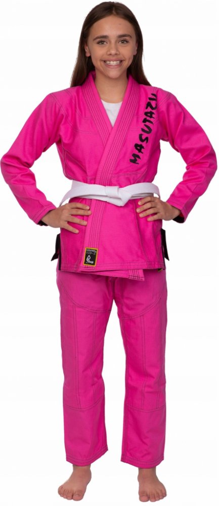 BJJ Kimono Masutazu Pink - 350 g, v růžovém provedení, navržené pro začátečníky a mírně pokročilé, je dostupné ve velikostech od žákovských (F0) po dospělé kategorie (F4). Vysoce kvalitní zpracování zajišťuje maximální rozsah pohybu a pohodlí během tréninků a soutěží.
