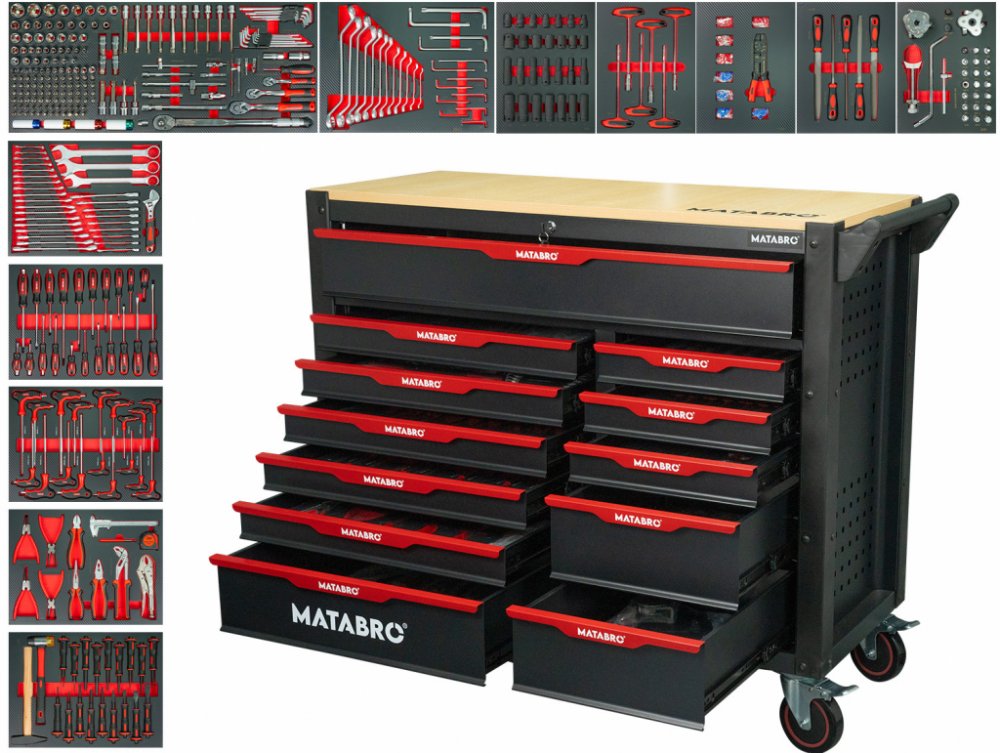 Tento celokovový vozík je vybaven dvanácti zásuvkami pro efektivní organizaci nářadí.