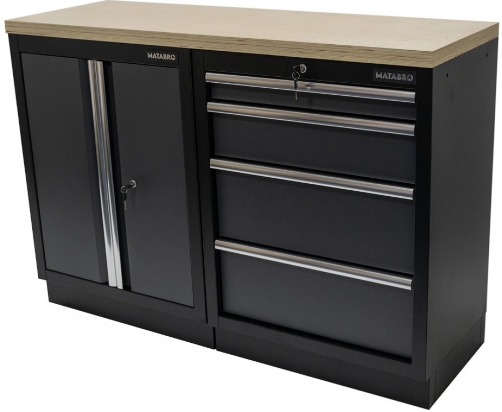 Maximální úložný prostor: Dílenská skříňka se 4-mi šuplíky a dvoudveřová skříňka s 1 policí, se postarají o všechen nepořádek ve vaší dílně!