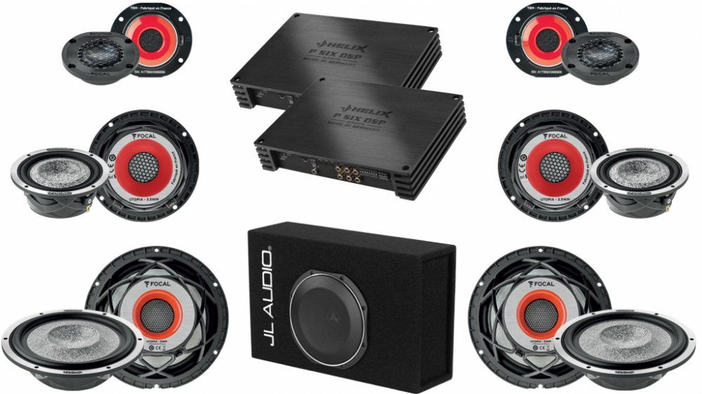1x pár 2-pásmových komponentních reproduktorů do předních dveří – Helix Ci7, Focal Utopia nebo Brax- 1x pár 2-pásmových komponentních/koaxiálních reproduktorů do zadních dveří – Helix Ci7, Focal Utopia nebo Brax- 1x pár subwooferů o průměru 20 cm pod přední sedačky – Helix Ci7, Focal Utopia nebo Brax- 1x aktivní subwoofer do kufru – JL Audio - 1x nebo dvojice zesilovačů s DSP procesorem nejvyšší řady – Helix