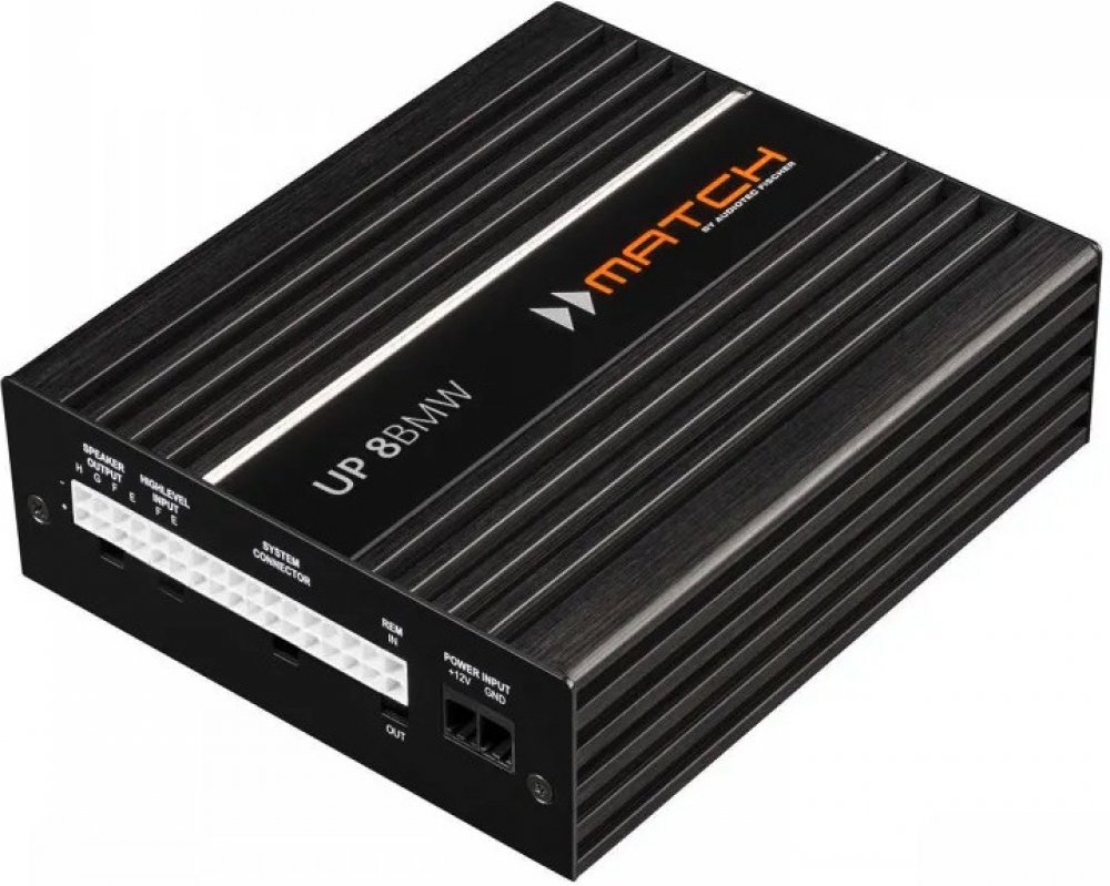 S UP 8BMW je možné jednoduché a bezproblémové připojení ke zvukovému systému BMW HiFi na původním místě instalace díky přiloženému propojovacímu kabelu plug & play a montážní desce specifické pro BMW. Pro zjednodušení dalších upgradů je dokonale navržen pro kombinaci s dalšími komponenty MATCH UPGRADE pro vozidla BMW, jako je subwoofer , 2-pásmový systém a centrální reproduktor . Samozřejmě lze také dosáhnout individuální konfigurace reproduktorů s celkem osmi kanály zesilovače a také s přídavným výstupem předzesilovače díky výkonnému 9kanálovému DSP. Každý ze dvou kanálů výkonového zesilovače poskytuje silný výkon s výstupním výkonem 160 W při 2 ohmech, aby pomohl i velkým subwooferům. Kromě toho se UP 8BMW vyznačuje rozšířenou konektivitou: Kromě inteligentního 6kanálového vysokoúrovňového vstupu s obvodem ADEP.3 je vybaven také MEC slotem pro rozšíření o další rozhraní, jako je Bluetooth ® HD Audio Streaming, vybavený. K dispozici je také 1-kanálový linkový výstup pro připojení dalších zesilovačů, jako je MATCH UP 1FX , a také optický vstup SPDIF se vzorkovací frekvencí až 96 kHz. Samozřejmostí je také SCP port pro volitelné příslušenství jako DIRECTOR , CONDUCTOR atd.