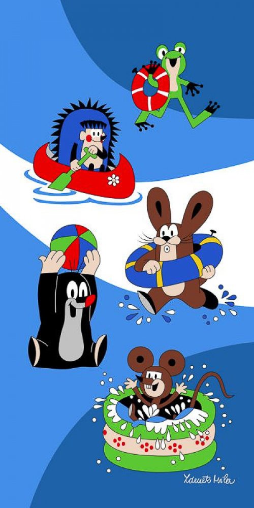 Dětská plážová osuška s motivem pohádkového Krtečka se svými kamarády u vody na modrém podkladu. Osuška je z lícové strany s potiskem, z rubu má jemné froté smyčky bez potisku. Osuška je vyrobena ze 100% bavlny.