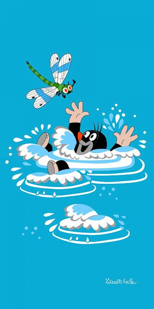 Dětská plážová osuška s motivem pohádkového Krtečka ve vodě s vážkou na modrém podkladu. Osuška je z lícové strany s potiskem, z rubu má jemné froté smyčky bez potisku. Osuška je vyrobena ze 100% bavlny.
