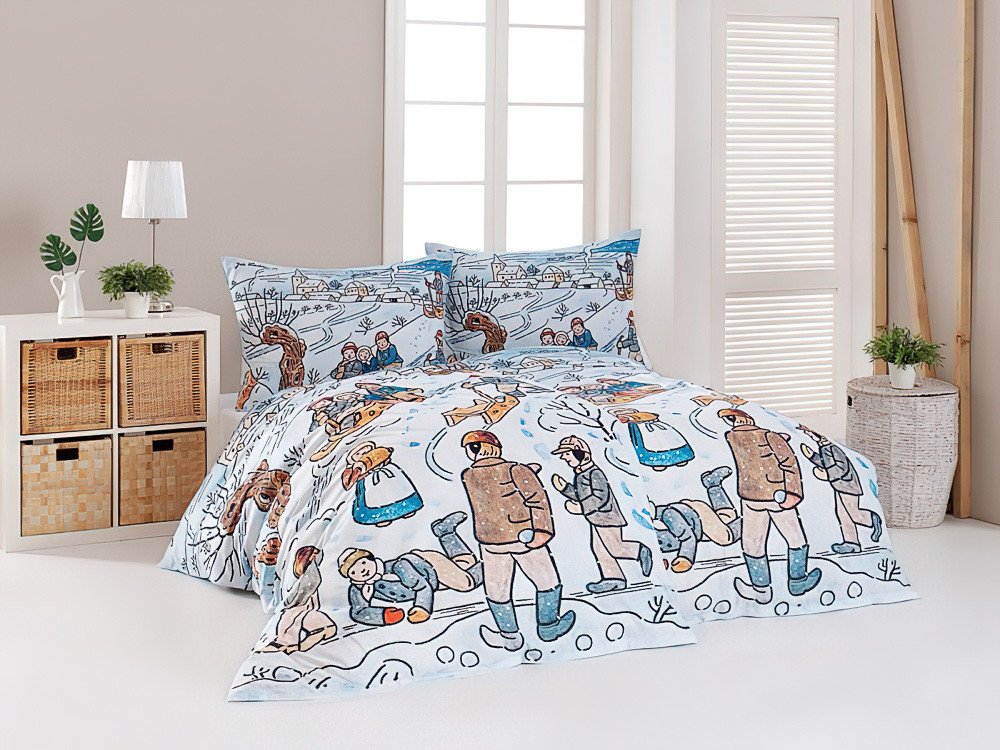 Bavlněné povlečení z originální kolekce Josef Lada od výrobce Matějovský s kresleným vzorem v typickém ladovském stylu. Přikrývka i polštář nese oboustranný vzor zimy na tradiční české vesnici. Vyvedeno je v bílých a modrých odstínech. Souprava je vyrobena ze 100% bavlny a obsahuje jeden povlak na přikrývku 140 x 200 cm a jeden povlak na polštář 70 x 90 cm. Zapínání na zip. Vzor je tištěn nejmoder...