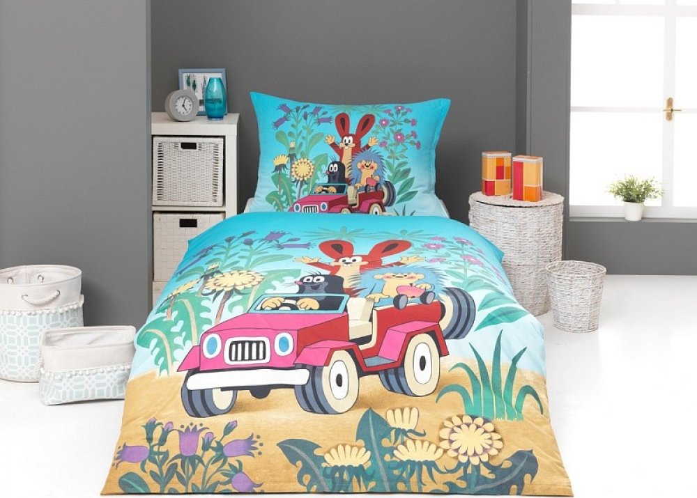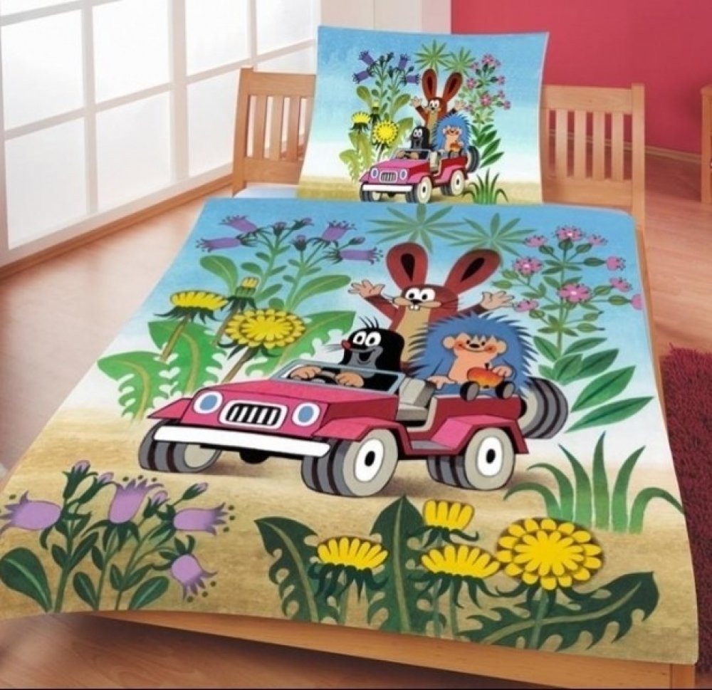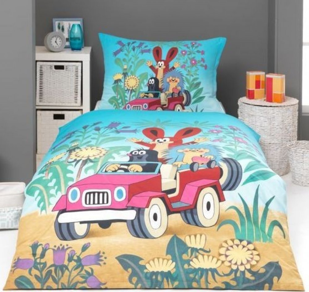 Krtek v autě provází děti mnoha generací, ty dnešní neopouští ani ve spánku. Dětské bavlněné povlečení s veselými postavičkami Krtka a jeho kamarádů v autíčku rozveselí dětskou postýlku a dětem se v něm bude krásně usínat. Maminky zase ocení vysoce kvalitní materiál. Povlečení je vyrobeno z té nejkvalitnější 100% bavlny. Je opatřeno pohodlným zipovým uzávěrem. Rozměr: 1x 140/200, 1x 70/90 cm