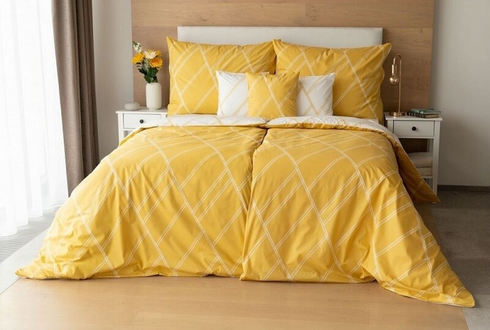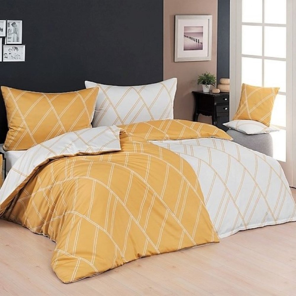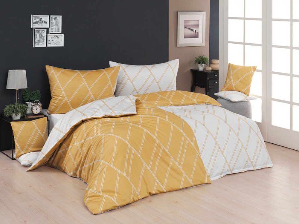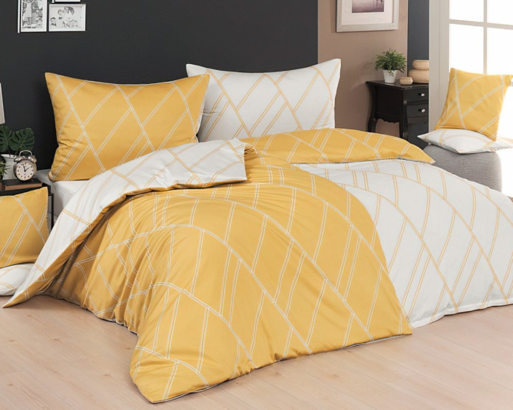 Povlak na polštář i na přikrývku zachycuje z jedné strany jemnou geometrii na krémovém podkladu, druhá strana je vyhotovena inverzně s medově žlutým podkladem. Povlečení je opatřeno komfortním zipovým uzávěrem.