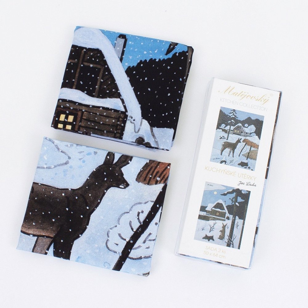 Bavlněné utěrky s motivem zimy a Vánoc se srnkou a zajícem v typické kresbě Josefa Lady v modro-bílém provedení v rozměru 50x64cm. Utěrky mají jednostranný vzor a jsou vyrobeny ze 100% bavlny. Utěrky jsou v dárkovém balení vždy 1x motiv srnka, 1x motiv zajíc.