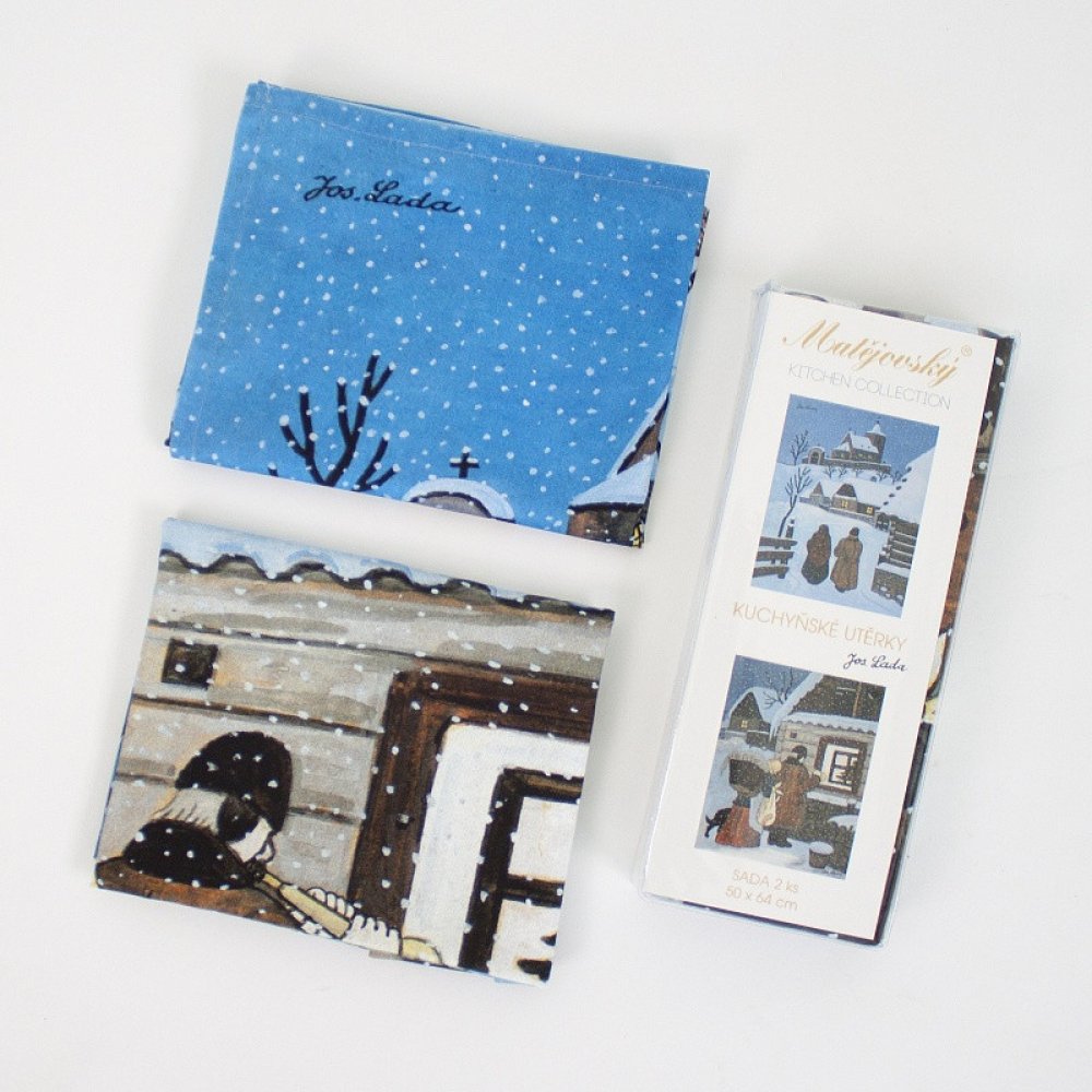 Bavlněné utěrky s motivem zimy a vánočního Štědrého večera v typické kresbě Josefa Lady v modro-bílém provedení v rozměru 50x64cm. Utěrky mají jednostranný vzor a jsou vyrobeny ze 100% bavlny. Utěrky jsou v dárkovém balení vždy 1x motiv srnka, 1x motiv zajíc.
