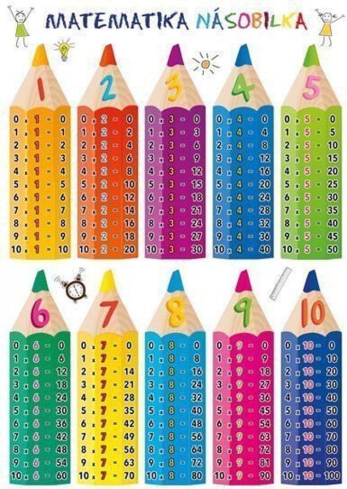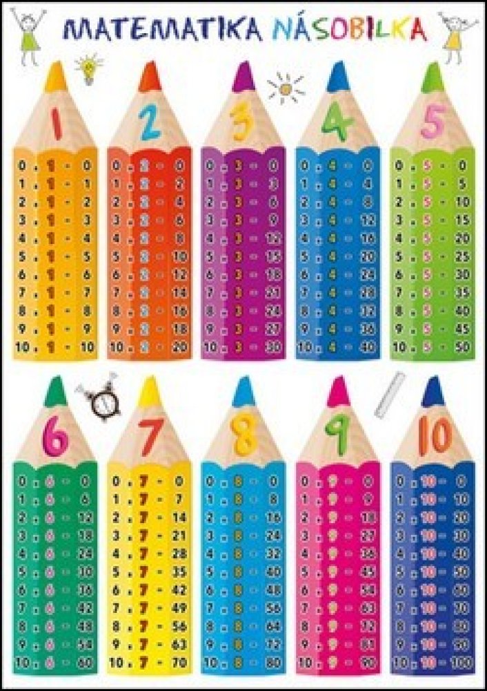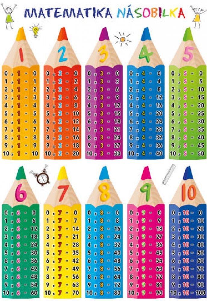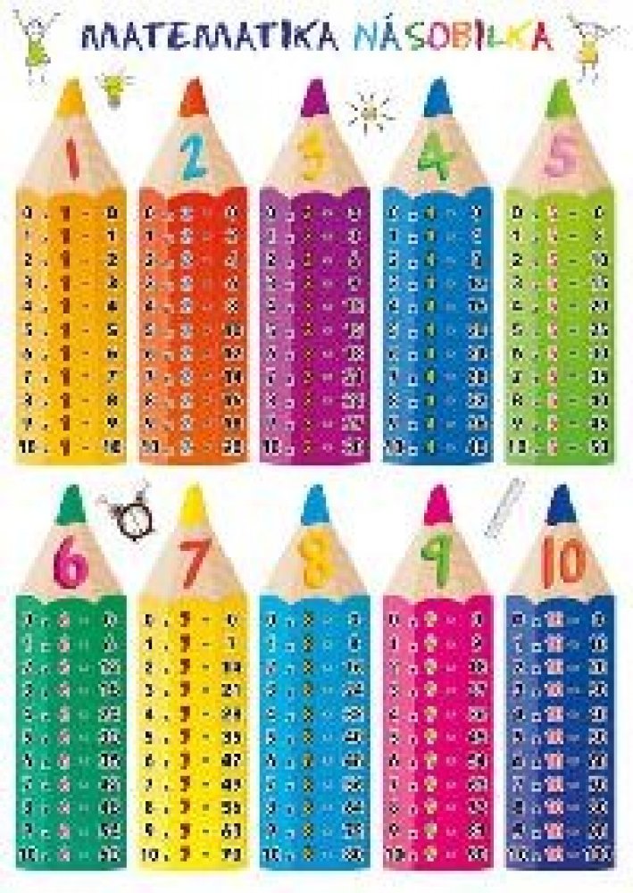 Publikace: Matematika – Násobilka - neuveden. Laminátová kartička určená především pro žáky základních a středních škol nabízí graficky přehledný a stručný přehled malé i velké násobilky. Násobky jednotlivých čísel jsou na barevně odlišených, pestrých obrázcích, které působí hravě a napomáhají lepšímu zapamatování. Publikace: Matematika – Násobilka - neuveden.