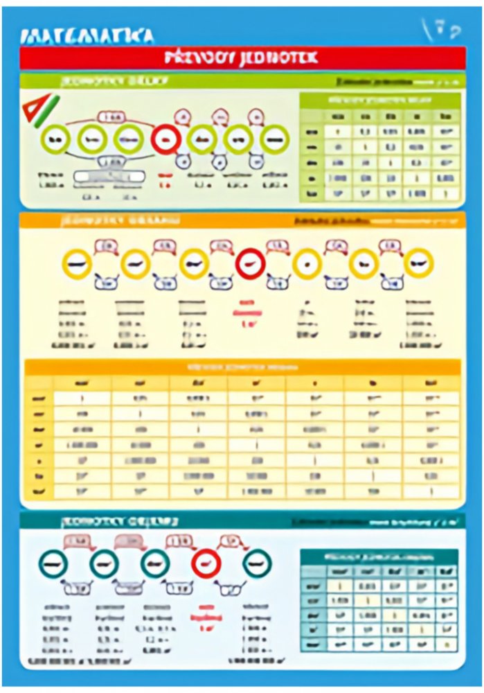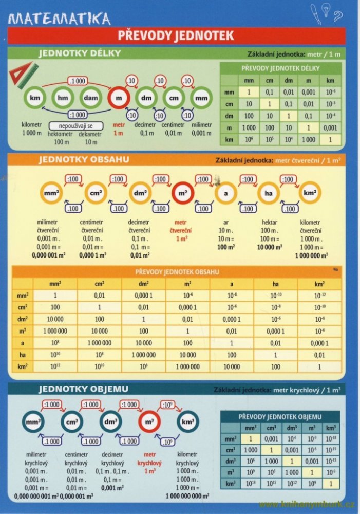 Laminátová kartička určená především pro žáky základních a středních škol nabízí graficky přehledný a stručný souhrn základních pravidel pro převod matematických jednotek – jednotek délky obsahu objemu hmotnosti času i velikosti úhlů
