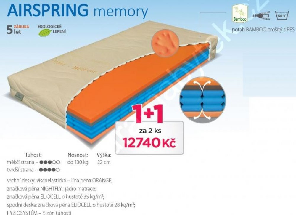 AIRSPRING memory - exkluzivní matrace s línou pěnou v akci 1+1 80 x 210 cm 2 ks Využijte akci 1+1 na matraci AIRSPRING memory. Dvě matrace za cenu jedné!